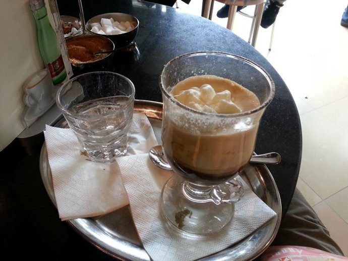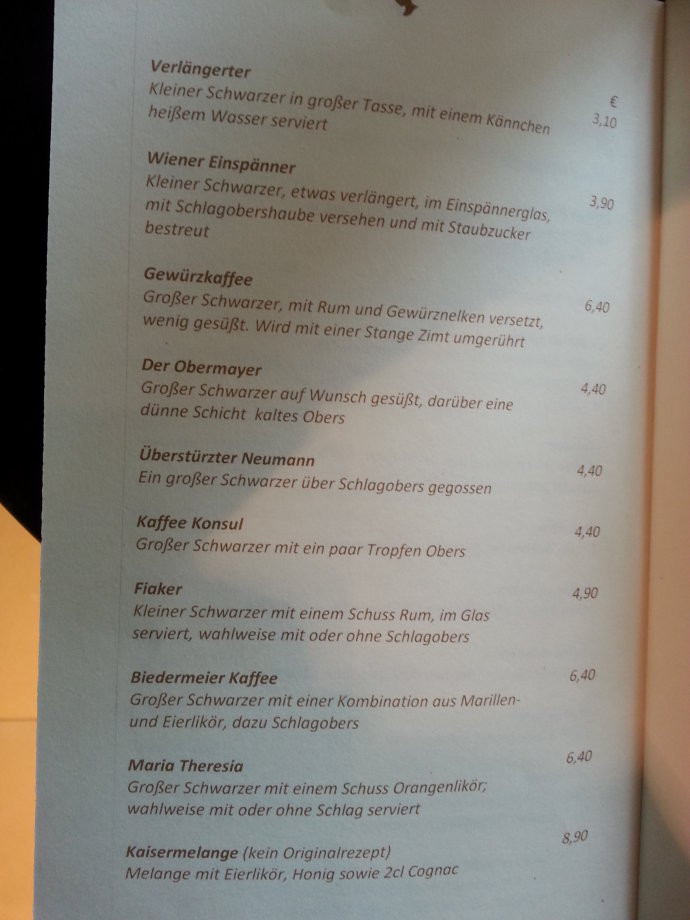 吃完出来,去同位于Kohlmarkt,就离Demel几十米路的Julius Meinl喝Einspanner(位于Demel东北方,和Demel同一边)。这是家小cafe,蛋糕没那么多,但咖啡种类很全,比我之前去过的都全,价格也没那么高,我点了Einspanner,3.9欧,很不错也。