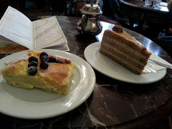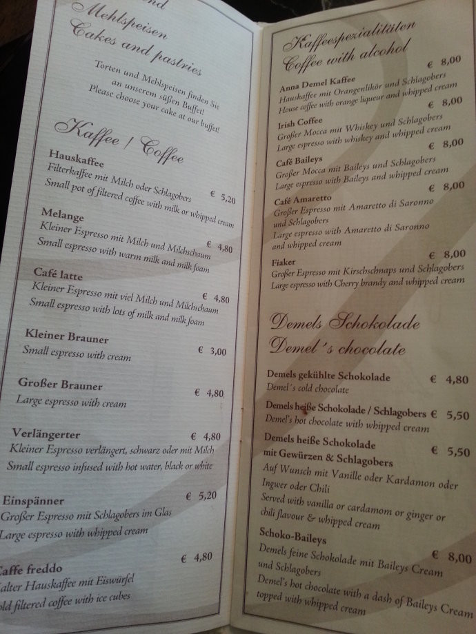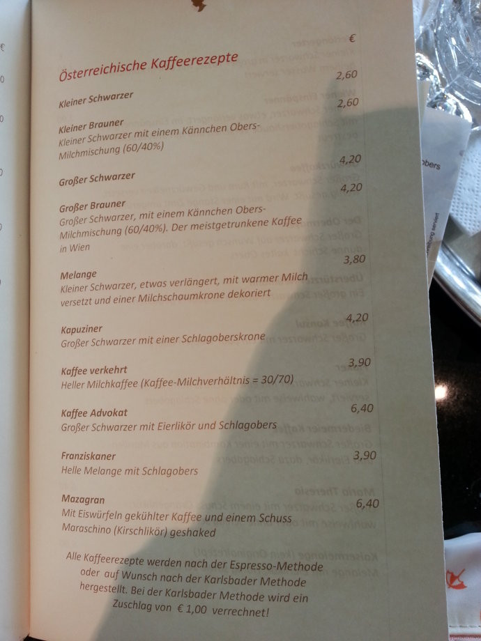 我去过维也纳三家有名cafe,这家的蛋糕选择最多!!!我吃了一个带咖啡的叫Kaffeexx(4.5欧)。一个有鸡蛋的Strudel(4欧)。本来 想喝Einspanner的,但见5欧多就算了,蛋糕本身已经够贵(此举实在明智,后来我去隔壁的小cafe喝了,3.9欧)。Kaffeexx挺好吃的,不过最上面那层还是甜了点。鸡蛋Strudel不知道为什么有很多水,影响了口感。这里的咖啡也确实贵,比 Sacher 还贵,最贵的要8欧一杯。