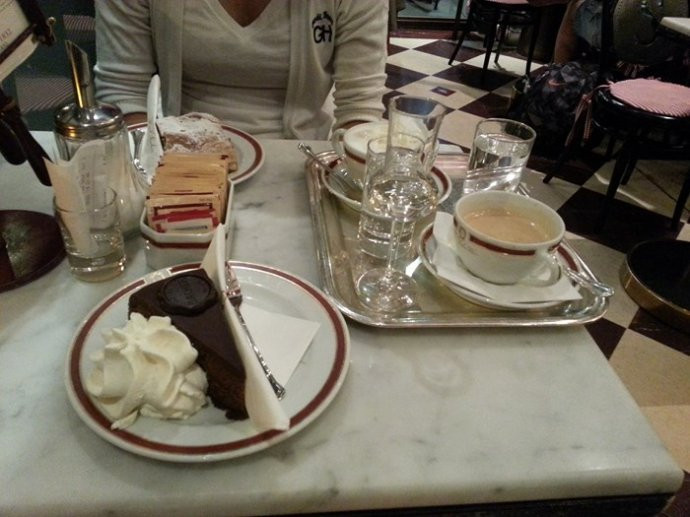 吃完饭去Cafe,这里有些cafe到12:00才关门的,Hotel Sacher 就是。坐地铁在U4 Karlsplatz下然后往北走。我们去到玩上10点了,不用等。但我第二天约4点经过,人巨多。