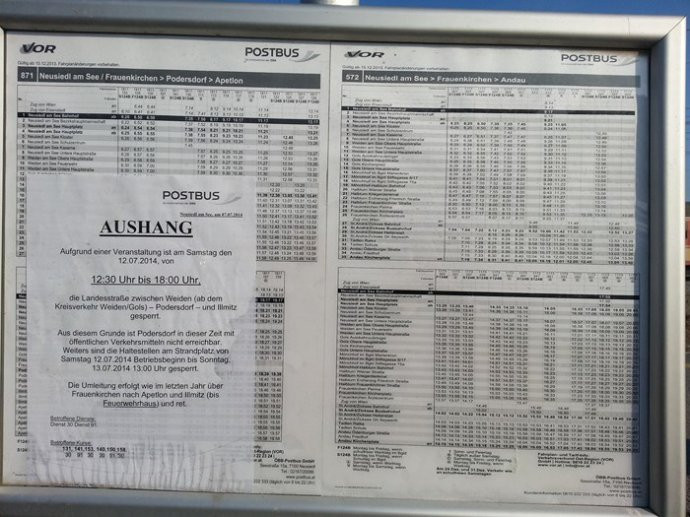 6:32的 Rex 2611下一趟去Neusiedl Am See的火车是 Rex 7919(8:32发车,9:14到),之后可以马上接9:17的871公交车。只是我想这个湖可能可以玩的比较久,就早点出发。另外就是火车和公交车之 间只有3分钟间隔,万一火车稍微晚点了一下,等再下一趟公交车就要等一小时,所以就早点出发吧,事后证明这个确定很明智,因为湖实在太好玩。