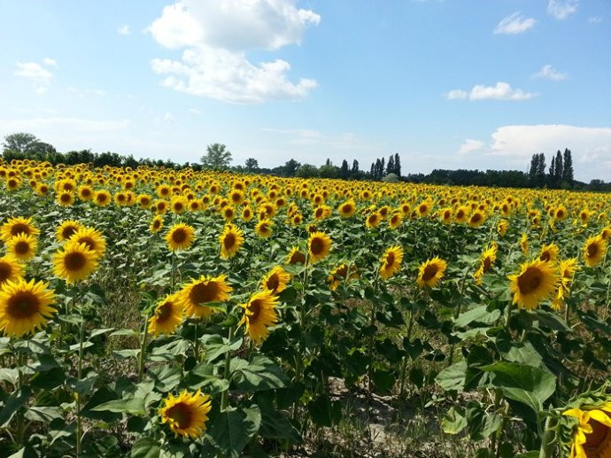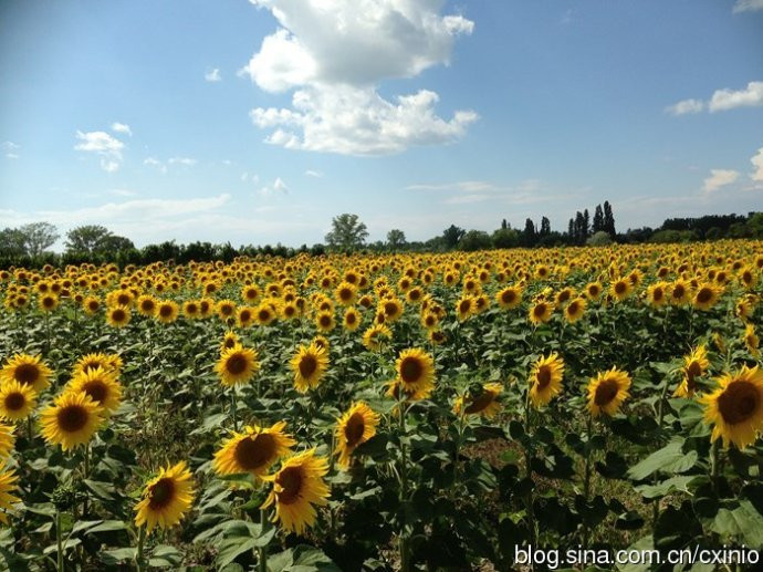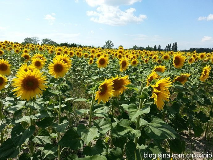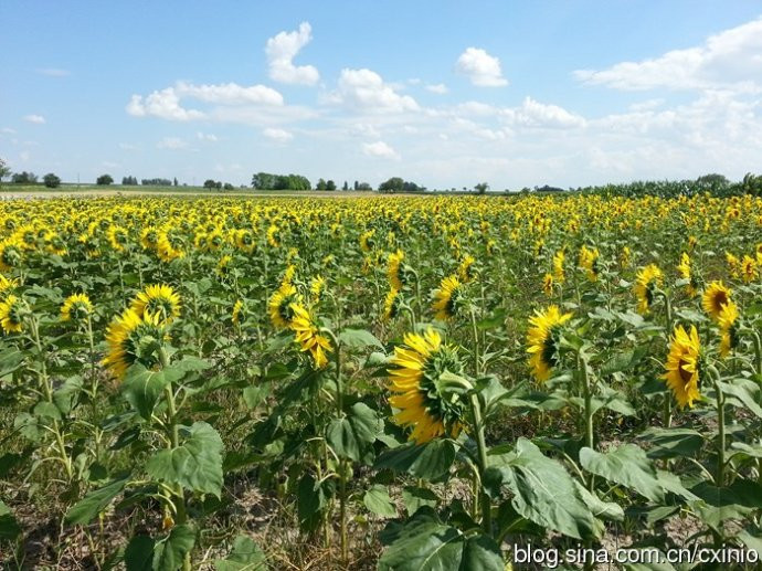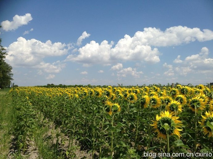 返程路上,经过一块很大的向日葵田。哇,好美。此事,北京奥林匹克森林公园也有向日葵展,小g发了些照片来看。但那里人太多,而且自然环境不同,差的太远了。当时蓝天白云,四周自然环境,而且那块田实在太大,那里还只有我们两个,随便拍照,很开心。