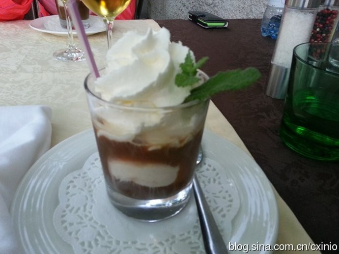 4个菜是有火腿的前菜,墨鱼饭,烤兔腿,甜品。我还点了Beerenauslese(BA)。之前我提到 Trockenbeerenauslese(TBA)这里我详细介绍一下。BA是同类型较低级的,TBA则是最高级的,高级低级由甜度来定。为什么就会这 么甜呢?是因为葡萄是腐坏的,大概是受了什么感染,水分会被抽干,干得好像葡萄干那样,所以甜度就特别高了。而每颗葡萄的腐坏程度是不一样的,做TBA得 每粒人手精选,所以就特别贵。一瓶要好几十欧,而且不是随便有的卖。而Neusiedler See就是有特殊的气候,所以盛产这种葡萄。BA德国超市倒是很多,五六欧就有。当晚我点了杯BA(3欧),普普通通,没啥甜味。但是,餐后他们送了我们 两杯TBA,那个感觉真不一样,金黄色的,非常好喝。除此之外,还送了个小前菜,我们两个人点一个套餐,甜品是一杯冰咖啡,也给我们分开两小杯,给的双倍 奶油和冰淇淋的呢。虽然主菜很咸,但是我们吃的很开心,而且服务又非常好,还送了那么多小东西,我们是给了不少小费,晚餐本身是58欧。这天运动确实多, 吃了那么咸的东西晚上竟然一点也不渴。
