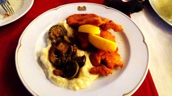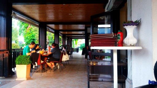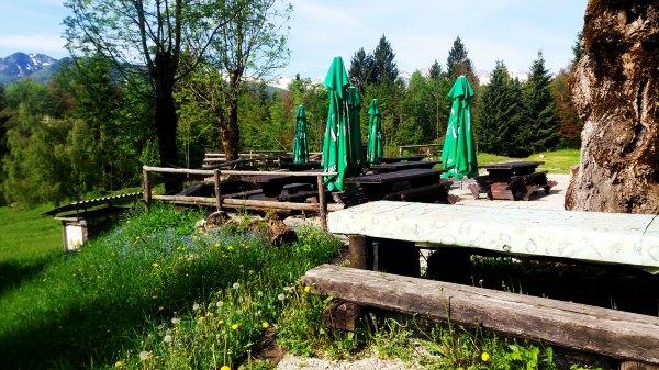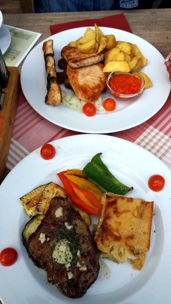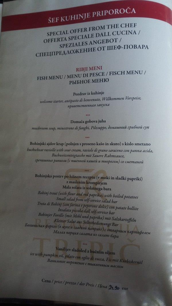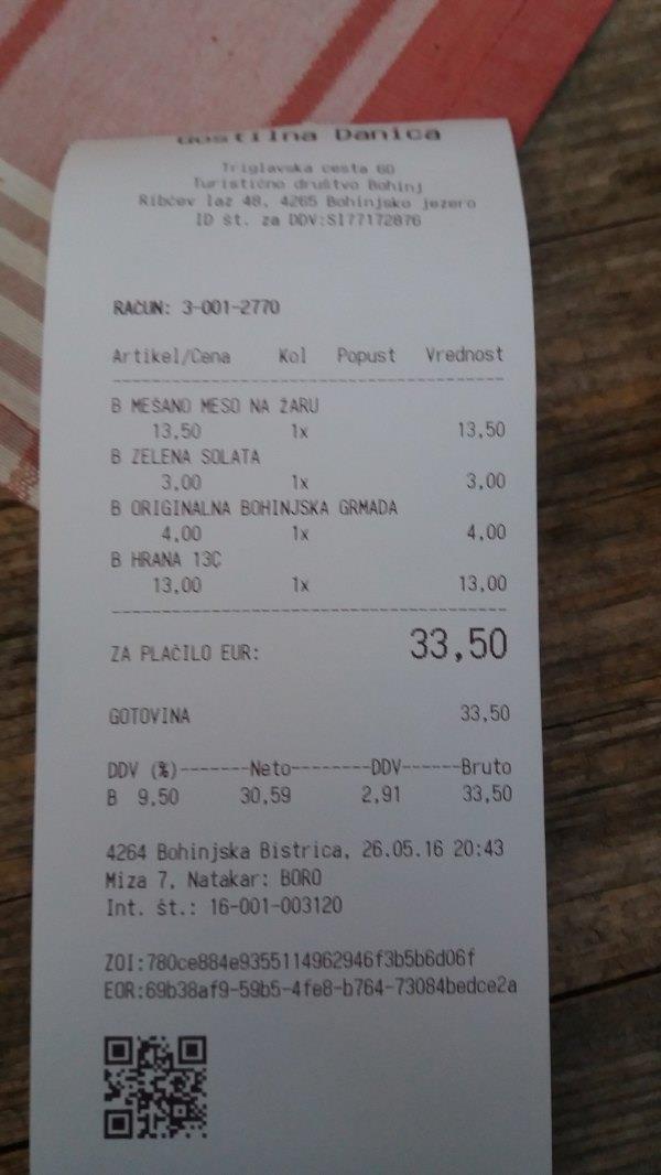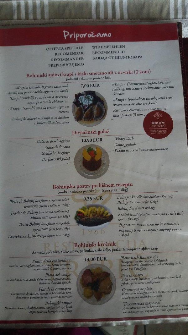 返 回Bistrica,我们就在车站西侧200米的餐厅Gostilna Danica(具体地址自行tripadvisor)吃饭,这里也是扎营的地方,sports4fun也在这。因为这两周野花节,这里还办野花宴呢。15 欧有三个菜,分别是汤,牛排和甜品,都有野花成分。这里环境很好,面对高山绿草的,服务也好,菜也好吃,值得推荐。由于去年在Bled我没吃到 grmada,今次在这里看到马上点,4欧一份。除此之外,我们还点了烤肉拼盘,没吃完,打包第二天吃。餐后还送了两小杯甜的利口酒。因为我们下午在面包 店没买到面包,所以就想在这里买些(斯洛文尼亚吃饭都送面包的),当时刚好他们快关门,就把剩余的送给我们了。