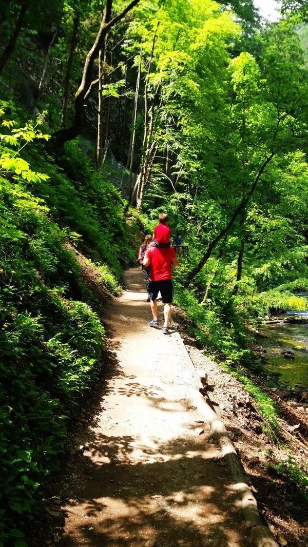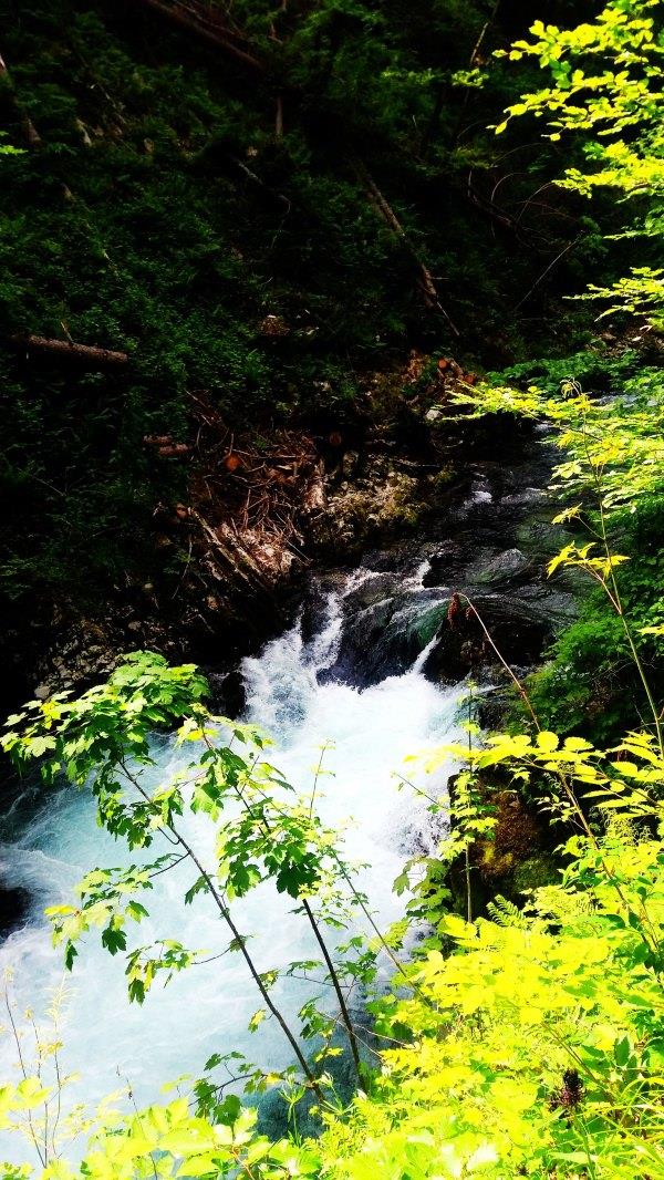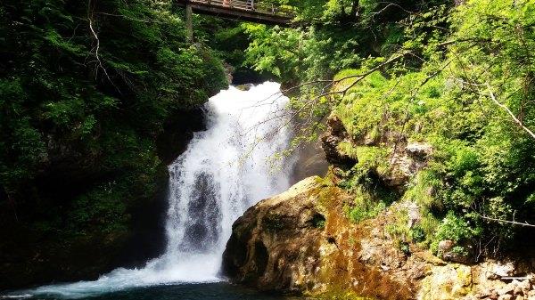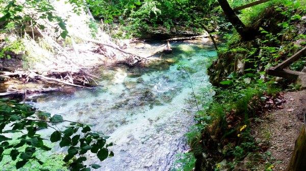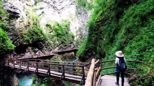 不 到一小时骑到Vintgar Gorge。我去年没去这,因为每年冬天都有很多树枝落下,要清理了才能开的。门票4欧,学生票3欧。门口有停自行车的地方。当时有很多旅行团的车,但我 们骑车来的,路上看的更多。这里主要是看水的,这条路其实无尽头的,一路延伸,我们走到后面一个大瀑布就原路往返了,其实走的路并不多,不过慢慢看拍拍 照,单程花了1.5小时,往返大概2小时。这里是峡谷,有些较窄的地方太阳晒不到,特别凉快。