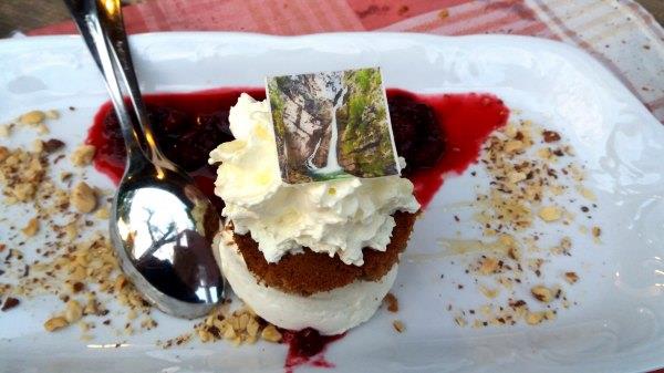 (下几图:我们的晚餐,第一个是野菜汤,第二是烤肉拼盘及牛排,图三四是grmada,最后是野莓甜品,上面照片是Savica Waterfall,照片不能吃的)