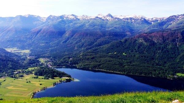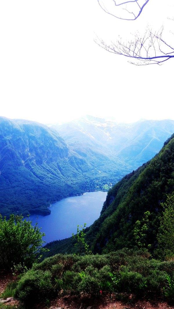 我 们先到Vogar平台,用时1.5小时。这里海拔约1000m,可以从Bohinj北侧俯视湖景。但由于湖太大,这又不够高,看的不是全景。在靠东一 点,Vogar Hut那里有另一个平台能看。这个时候有一个住在Stara Fuzina的mm,她说现在放假回家,这个平台是她最喜欢的地方,平时早上爬山来当运动。
