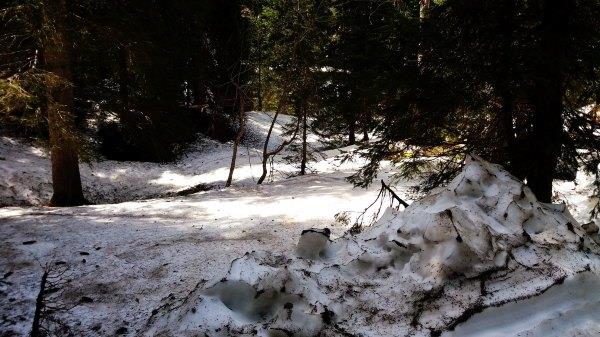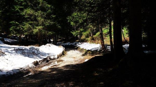 进湖前有段路雪还没化,有雪和没雪的地方分界很明显,有雪的地方一进去好像开了空调那样,而且雪还挺厚,非常突然的。但雪只在两旁,我们走的路没有。不过这里有另一条路下山的,被雪封了,我们下山时只能原路返回。