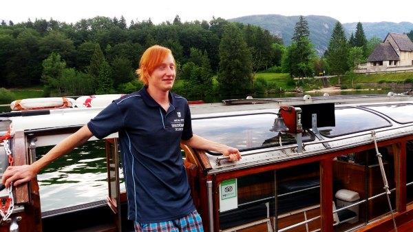 这 里游船是有导游的,可以给小费。一上船感觉这个船好像国王湖的游船,原来还真是从那里来的。但不一样的是,这个船的人少好多,坐的很舒服,当时就只有4个 人。船的门是打开的,你可以出去看风景。据导游Dan介绍,这里很多瀑布,但要刚下完雨才看到。不过最尽头的Savica Waterfall则是一直都有水的,船开到最后时可以远距离看到。下雨下的大的时候,水位还可以升好几米。为了避免污染,这里的船都只能是电动或者划 船。这个湖的确保养的好很,水很清。我问他去过Triglav没有,他说13岁他爸就带他去,后来他也去过,前后17小时一天往返。我想在这里的人都是登 山高手。的确,这里能爬山,有丰富水上活动,冬天能滑雪,这里的人多多少少都会运动的。