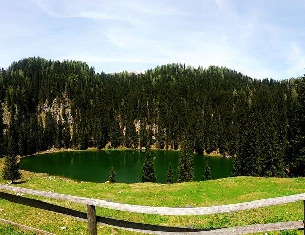我 其实一开始计划是两天登山的,想去Seven Lakes。这是在山上的7个湖,位于Bohinj西侧,最底的一个在1300多米,最高的2000。7个湖都有不同颜色,各自有自己名字。但就是因为山 上住宿不开,只能一天往返。我当时就打算只去第一个湖Black Lake(Crno Jezero),预计单程5-6小时。但当时到9:30,我们去到一个地方那里有指示牌,显示还有4小时才能到那,我们就改变线路,去另一个湖了。这个湖 没有名字,就是在Koca na Planini pri Jezeru mountain hut。绿色的湖水,有鱼,非常漂亮,在1453米。