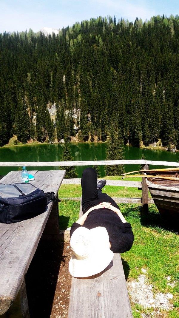 走 着走着,大概12点,这时我们走了约四个半小时,我们终于到湖了,这里海拔1400多米。这里的hut有茶,咖啡瓶装水,都是1.5欧。但不能用厕所,阿 姨说的是没有水。我们在湖边近看湖景,那里有鱼,湖上有闪烁着的小点点,非常漂亮。这个湖水是碧绿色的,很清澈,没有污染。之后我们就在hut那里喝茶, 小j睡了一会。