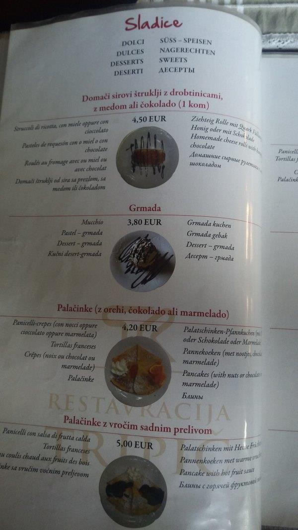 推荐食品:Grmada, 是混合了不同东西的甜品,一份约3-4欧。其实是Bled原产的,但cream cake在Bled宣传得太厉害,grmada没人知道,在Bled不太好找,不过这边很多。据说这个甜品当时是有客人要点甜品,但厨房什么都没有,厨司 在情急之下临时想出来的。当时就把厨房里的东西混合起来,这个甜品包括巧克力蛋糕,香草布丁,酒,葡萄干等。