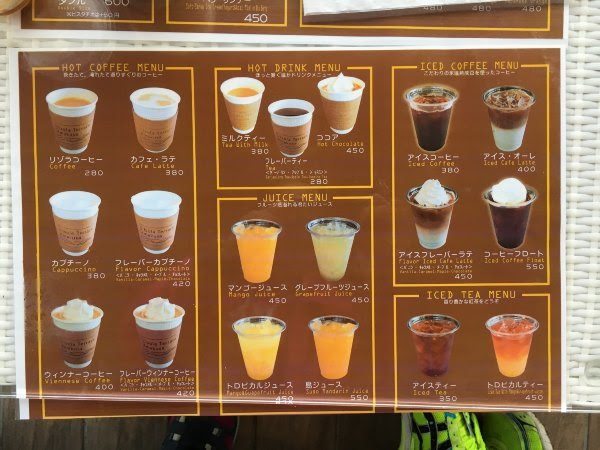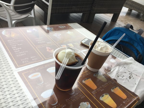 走着走着有点下雨。感恩这个时候我们已经下来,而且雨还不大。我们萌生搭便车的想法,此时看到一辆像出租车的车迎头过来,心里想一会儿会不会回头。后来看到一辆私家车,想截停没理我们。再走没多久原来的出租车来了,此时我们在这条公路上走了不到一公里。很开心,没想到在这没人的农村能打到车。我们坐了三公里多吧,1220日元,打到酒店对面的Liso Terrace喝咖啡补补。