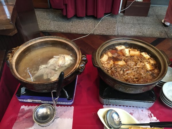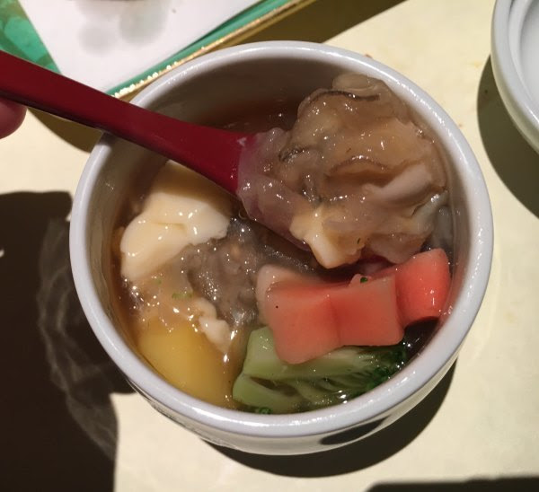 这个鸡汤很好喝。右面的卤牛肉也很赞。