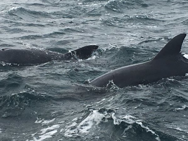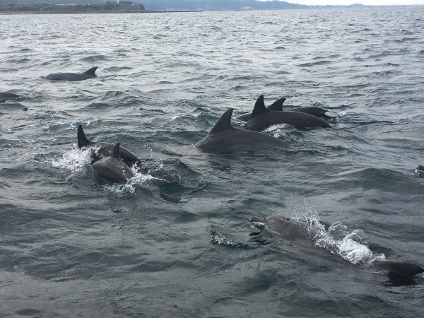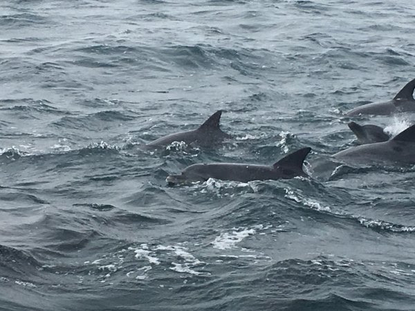 好了,到了海豚区了,这里据说有200条海豚,它们一会儿在这个地方出来,出现一两分钟,之后潜水(我看它们潜水时游得很快),然后一会儿又在另一个地方冒出来。我不知道我们看的是不是都是同一批海豚。