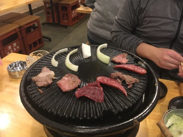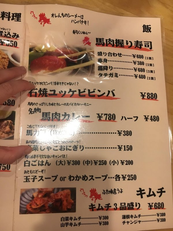 晚饭去赤坂的樱屋马肉烧烤。虽然本身没有对马肉很感冒,但毕竟是这里名产,就试一下吧,毕竟也不是很贵。我们点了一份2人份量的马肉拼盘(这个3000多),一份和牛,还有烤蔬菜及两碗米饭,埋单6522日元(两个人)。这里菜谱有中文,但没日文菜谱详细的。