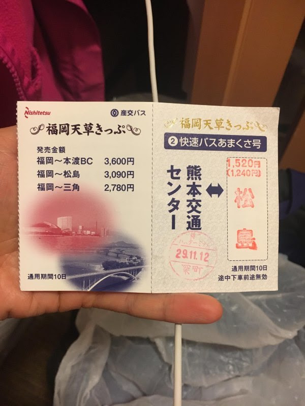 我们买的是去天草松岛的优惠票,总共3090日元(不然从熊本去松岛的公交车本身要1520的,我们在松岛前一站-前岛下车)。我们坐17:20的车去熊本,在大巴站3楼38站台发车,走的高速,基本不堵车,两小时到。