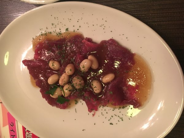 Alpice Due放题有马肉刺身,昨晚吃了熟的,今晚我试了生的。店家放了很多醋,调味挺好,使得这个马刺挺好吃,没有肉的腥味。这个肉口感也不错。