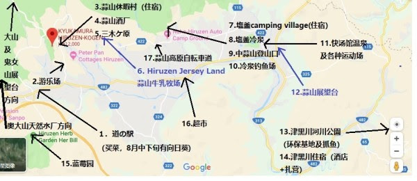 下面是蒜山高原的游玩地图(只含我研究过的地方),这里大概海拔500米 (当然不能跟中国的真正高原相比)。夏天去温度稍低,我们去的时候温度正好合适,不冷不热非常舒服。