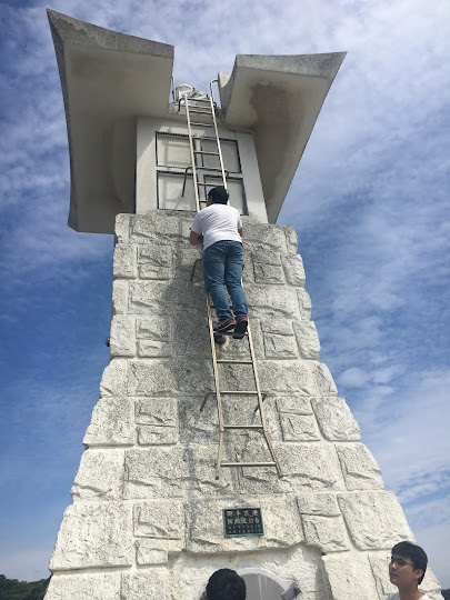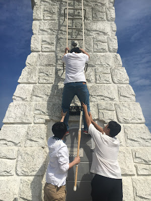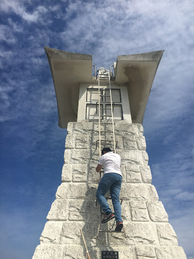 好了,我们现在要上演《onion学长勇救无人机》一剧了。话说j同学的无人机在绕着灯塔拍照时,不小心撞向灯塔,跌在灯塔上。只是灯塔的梯子还是挺高的,爬上去有点难度,但不是不行。