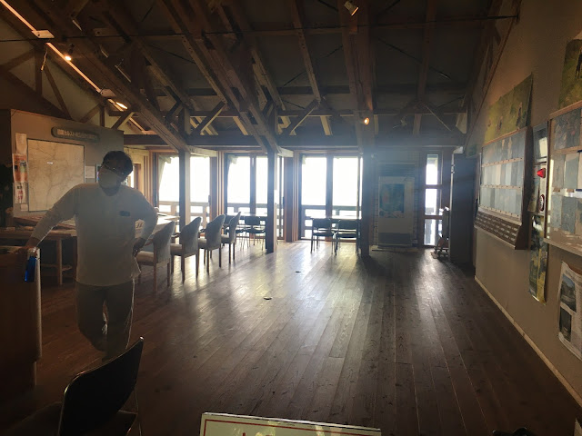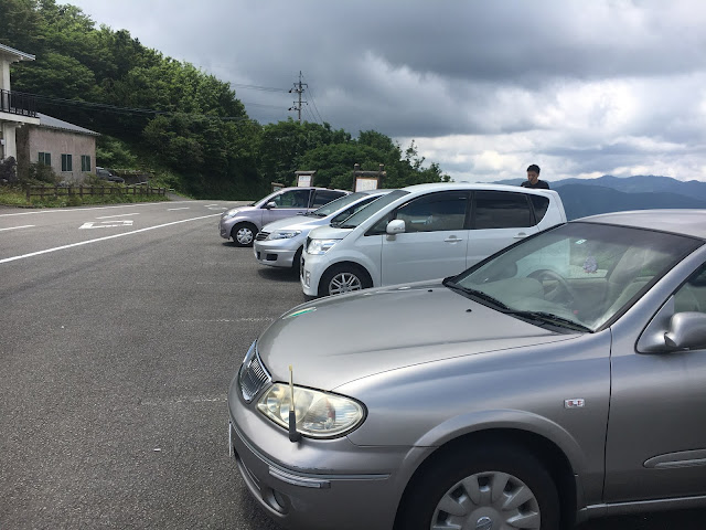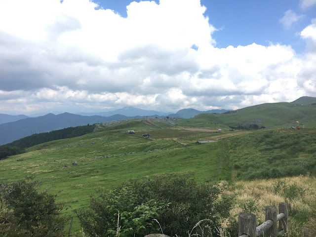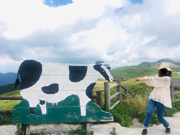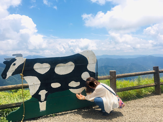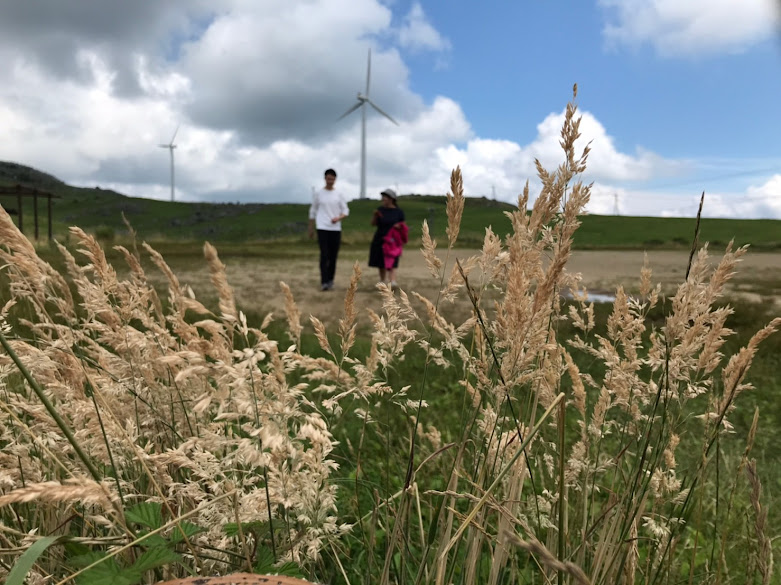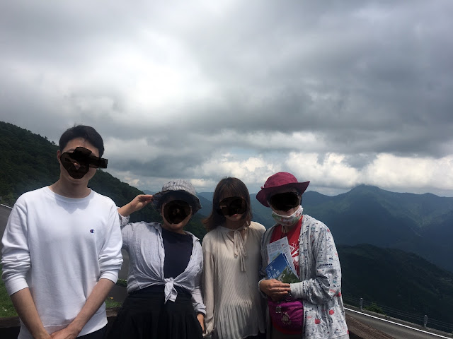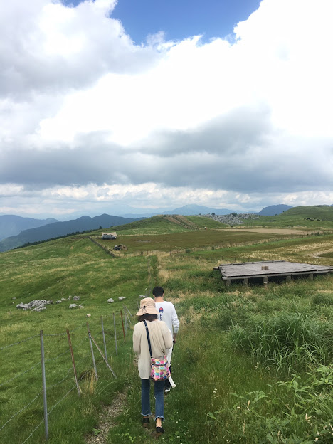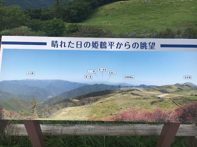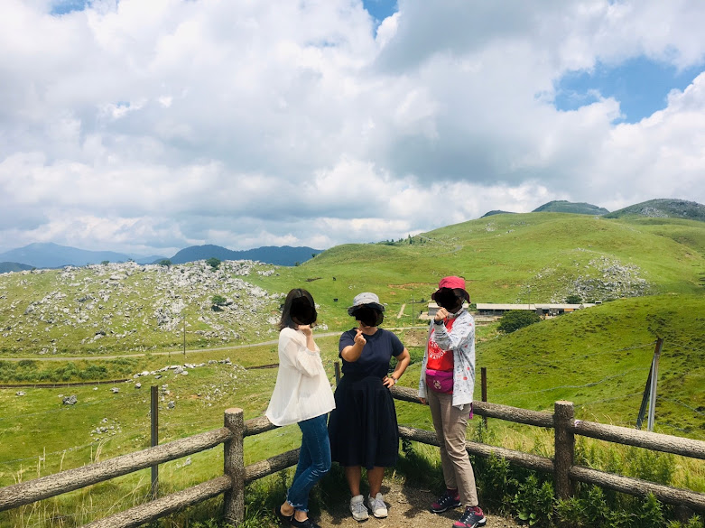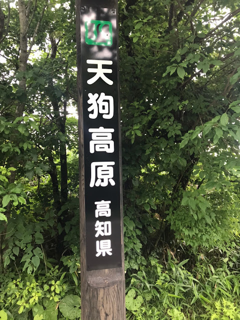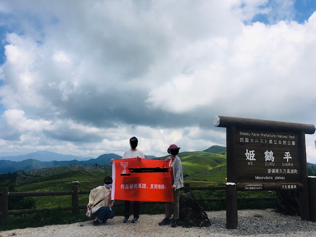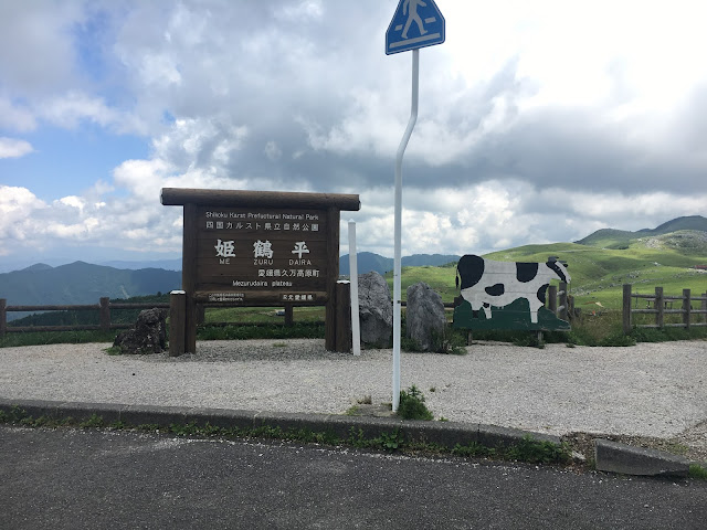 我们到天狗高原了,车停在那里介绍カルスト的博物馆(免费,可以上厕所),进去要脱鞋。这里有职员,当时没有其他游客,他很热情的给我们介绍。这里有个观景台,帮我们拍了一张正经的合照。这位大叔看衣服应该是天狗庄的人,说一口关西腔。天狗高原有长有短的徒步线路,不过我们时间不够就没去了。另外,这里已经是高知县了,比起姬鹤平那里海拔又高了点。
