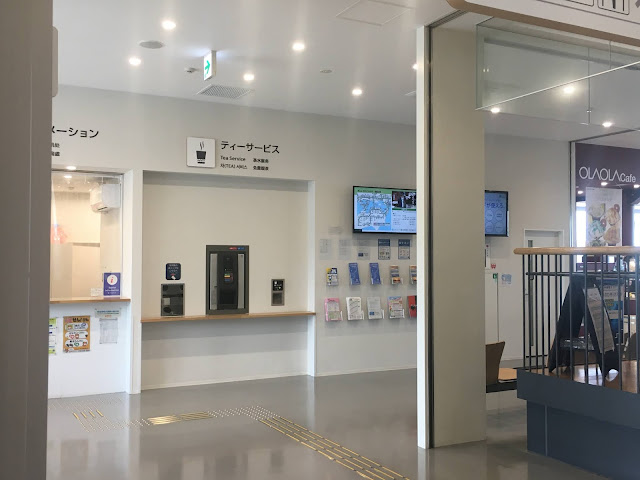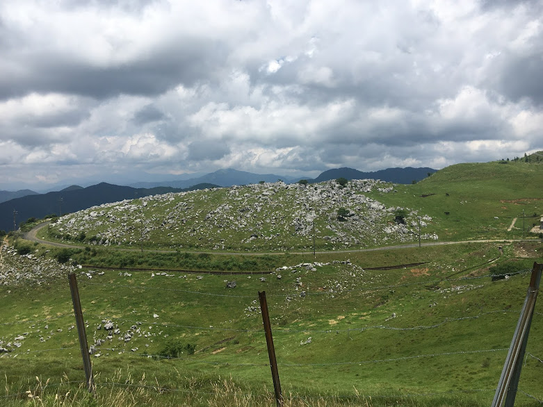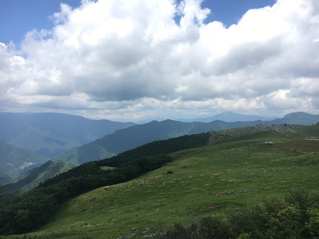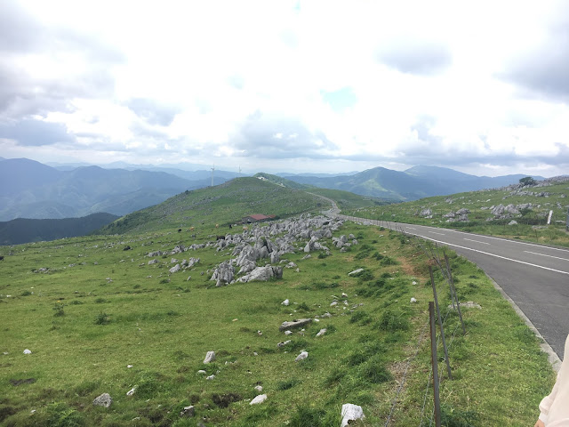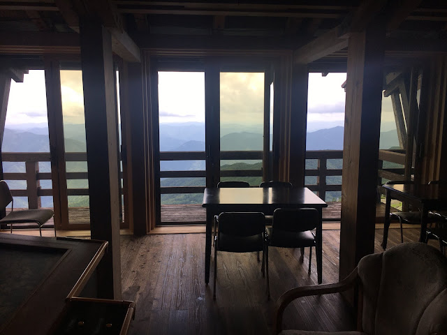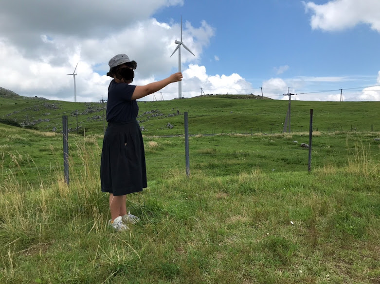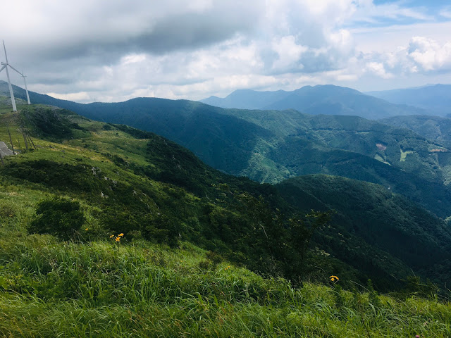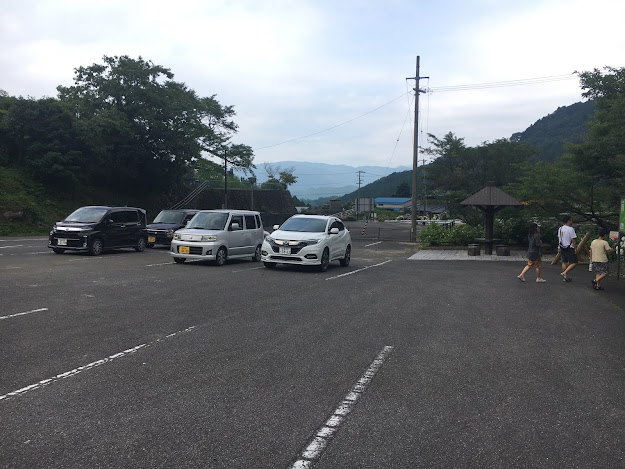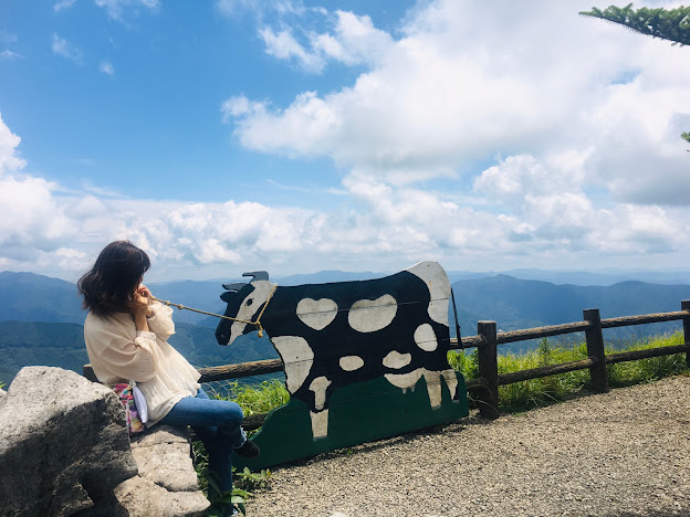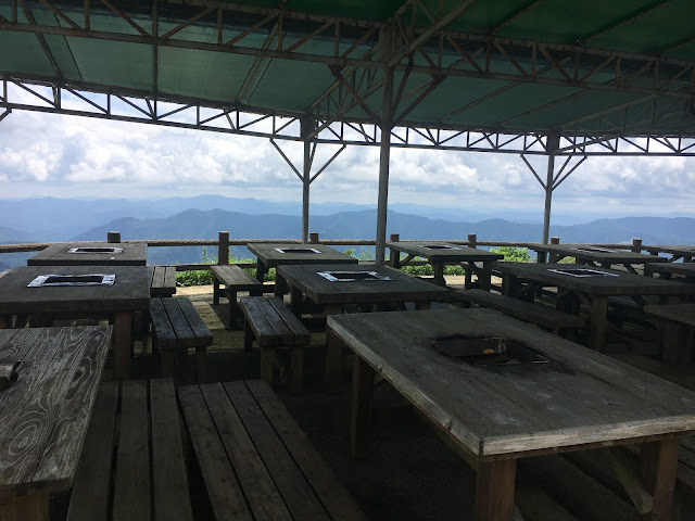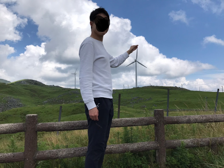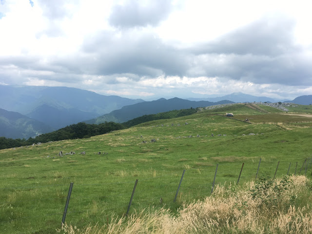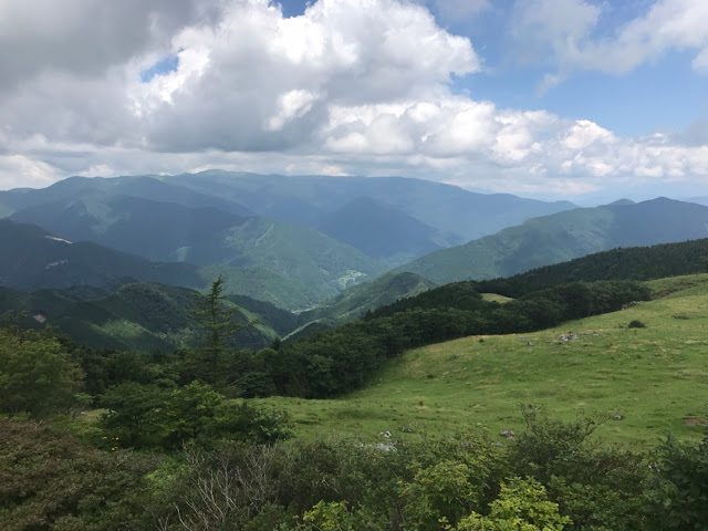 我们到天狗高原了,车停在那里介绍カルスト的博物馆(免费,可以上厕所),进去要脱鞋。这里有职员,当时没有其他游客,他很热情的给我们介绍。这里有个观景台,帮我们拍了一张正经的合照。这位大叔看衣服应该是天狗庄的人,说一口关西腔。天狗高原有长有短的徒步线路,不过我们时间不够就没去了。另外,这里已经是高知县了,比起姬鹤平那里海拔又高了点。