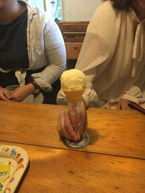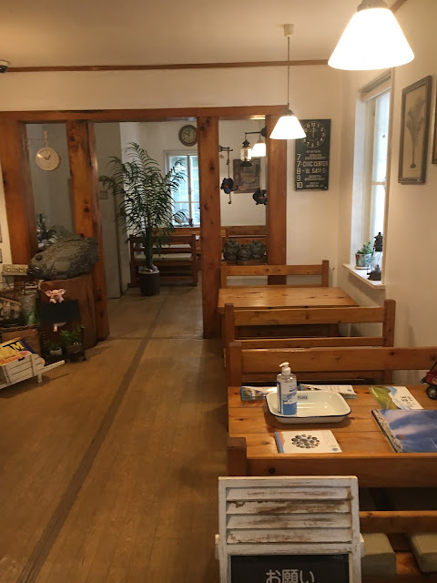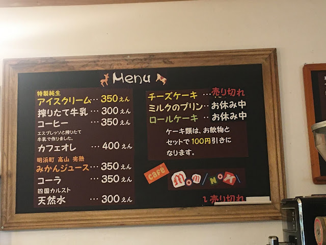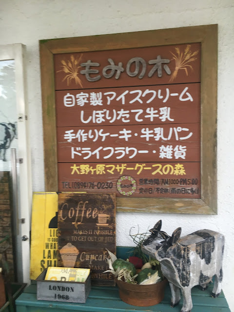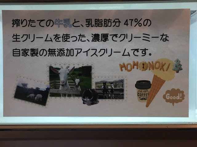 天狗庄有冰淇淋,不过我们去了383公路西侧的店吃,离天狗庄大概10几公里,这里有两个店(地图标了绿色),一个是ミルク園,另一个是もみの木,我们先经过ミルク園,当日竟然维修,店家看见我们也出来表示歉意,之后我们就再开几百米去もみの木。这个店有流心奶酪蛋糕,我很想吃的,但没想到这个小店竟然也会买完!但没关系,我吃冰淇淋喝冰咖啡已经很满足了。冰淇淋是用高原牛奶自家制的,350日元,脂肪含量47%,果然很香浓。咖啡也是用高原牛奶,也很好喝呢。这个小店的装修也很漂亮,坐着很舒服。