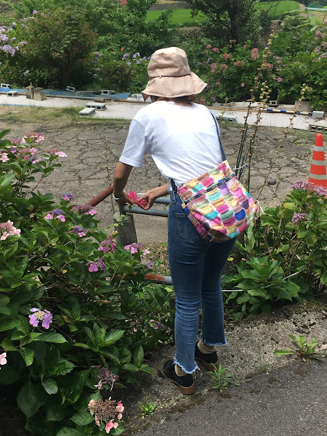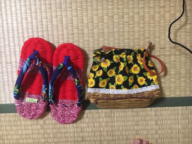 晚饭后,我们抓住最后机会,在酒店商店关门前(9点关门)几分钟进去购物,里面有些手作的礼品,我买了一个很别致的向日葵小包(1100日元)及拖鞋(1000)