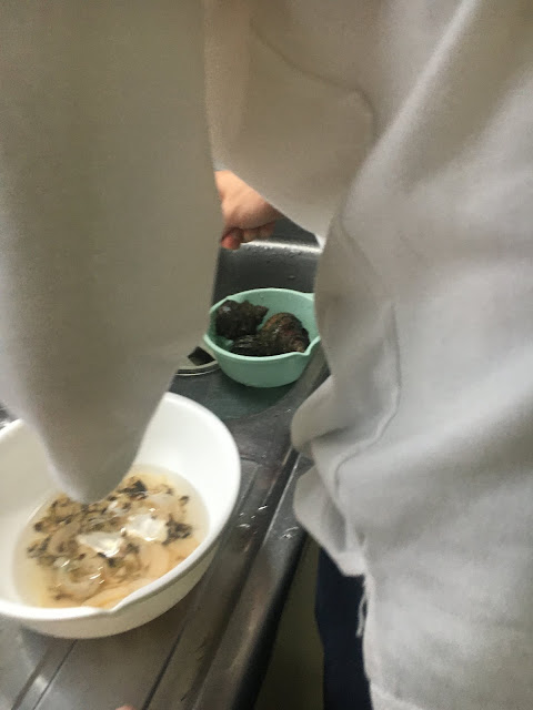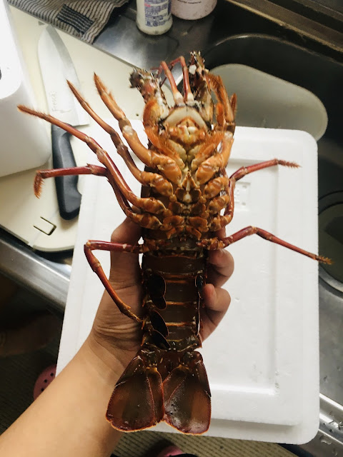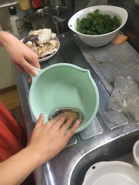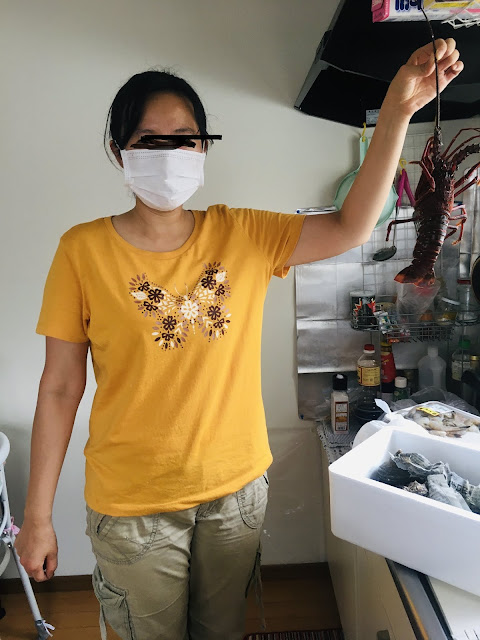 下午4店海鲜准时送来。我们就准备动手做了。今天洗碗王子摇身一变做大厨,处理伊势海老,蝾螺及鲍鱼(lele也帮忙了很多)。他还看了youtube,知道要用冰镇(我其实都没看过如何煮,不过今晚的素菜都是我提供的。)