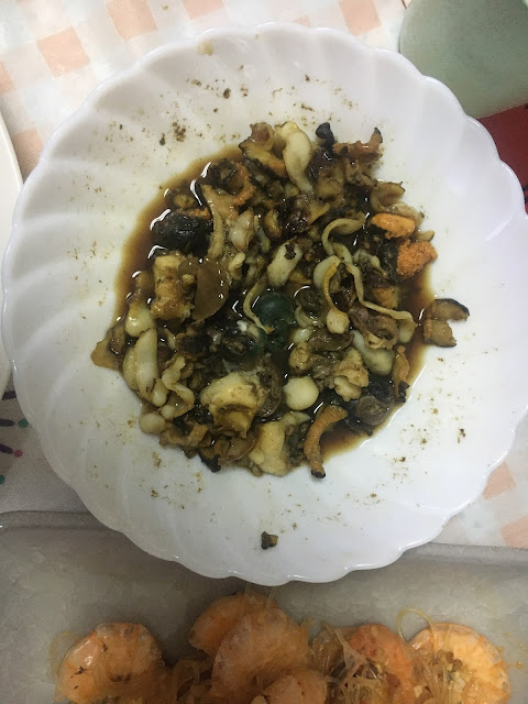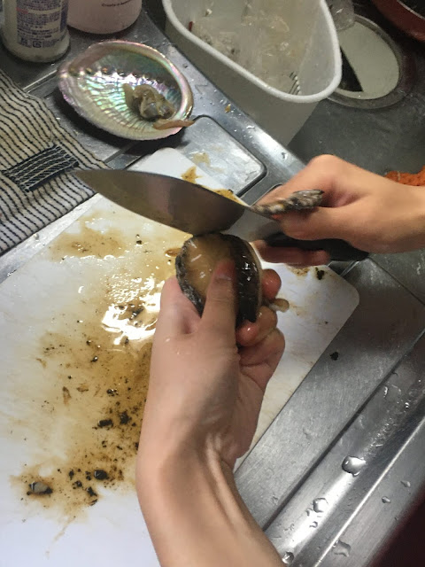 蝾螺我们不是很会弄,敲开了几只,余下的敲不开,先留下。鲍鱼lele切了薄片(她的刀工是一流的),然后加蝾螺及酱油放微波炉煮了。