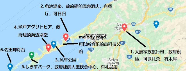 西边狭长半岛是佐田岬(旅游官网) 。半岛有自行车提供的,由于政府营运,收费特别便宜,电动车一天才2000。可网上预约。