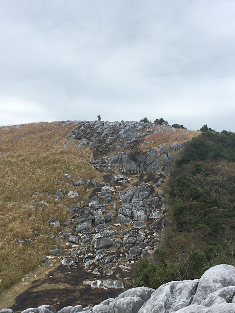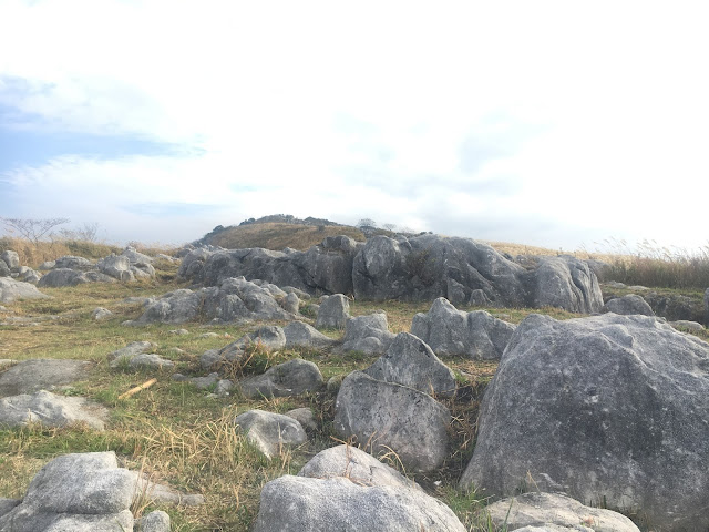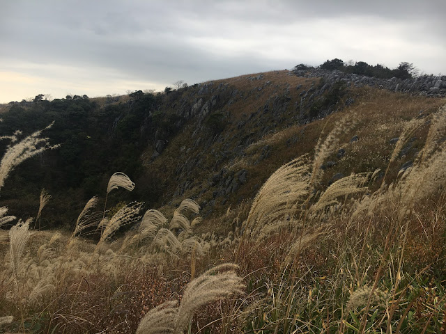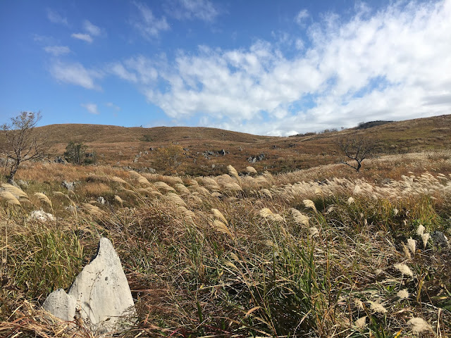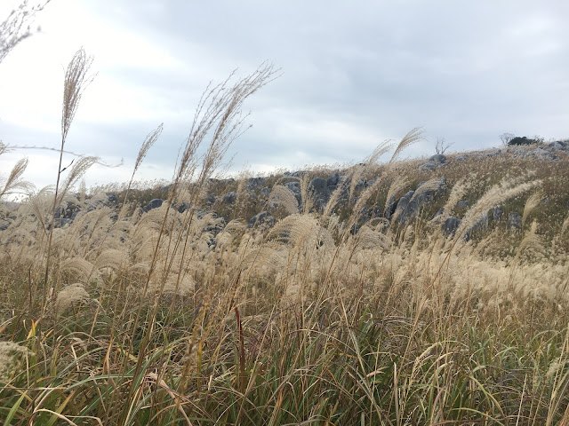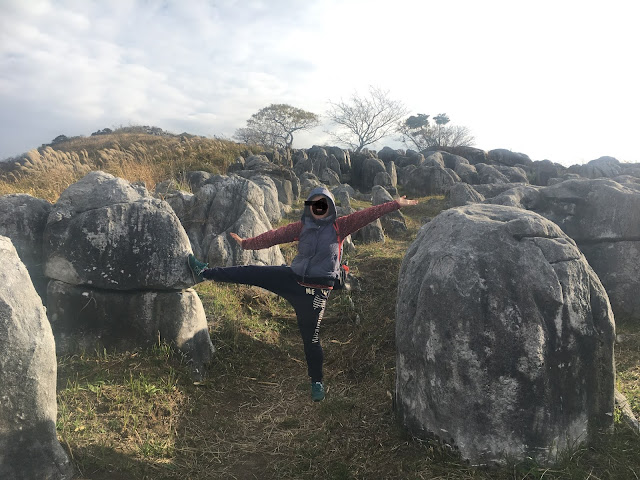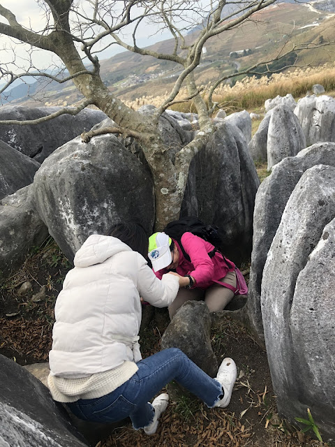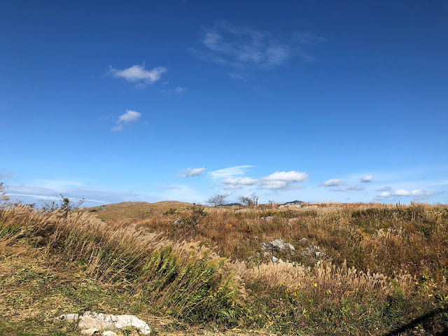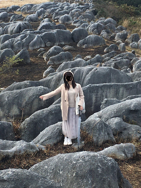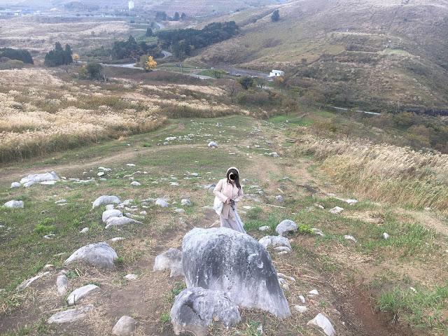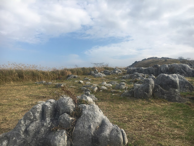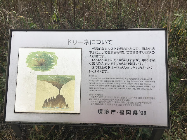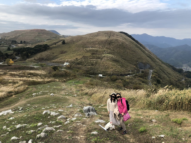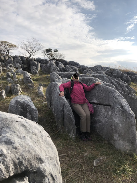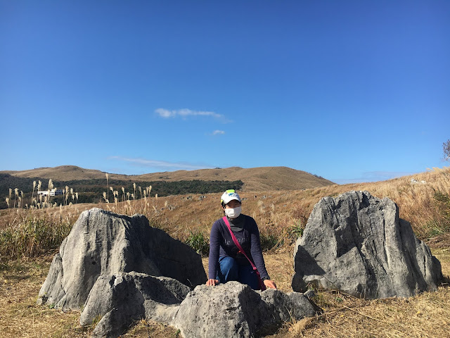 今天7:30起来 ,去最后一个喀斯特 - 平尾台,距离大概20公里,去程由于很早,不堵车,最后5公里爬坡,但不算难开,走了大概30分钟到。在最后5公里爬坡之前有便利店,那个店的厕所是我去过便利店最大的,有三个,女士厕所还有换衣服的地方。因为预报下雨,pp买了把伞最后当登山杖用。