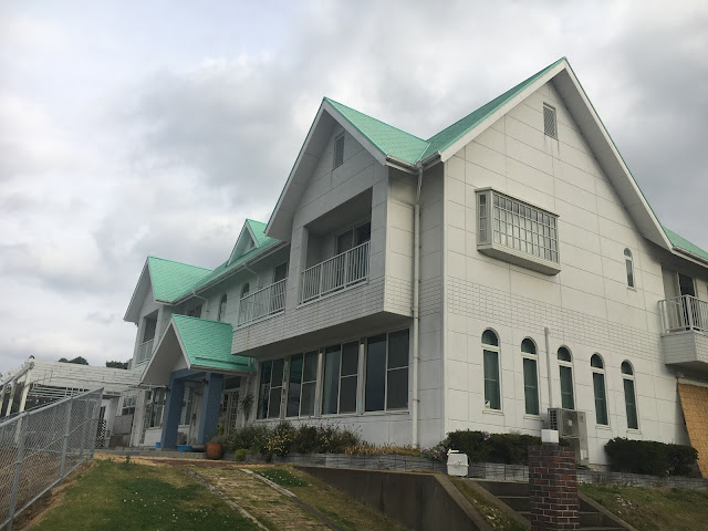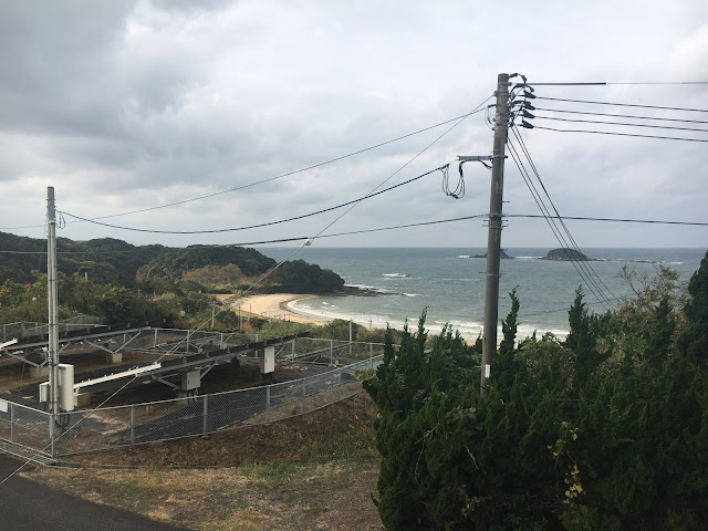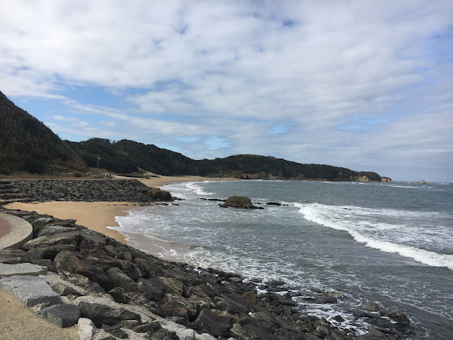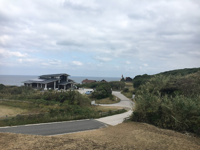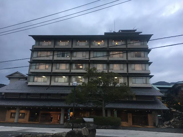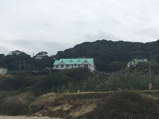 我们住的酒店靠西边海滩,可以看日落的,不过当时阴天,也没看成,这个季节去想看日落得5点就开始了。虽然看不成,但也不遗憾呢。从元乃隅神社到酒店的路很好走,我们大概6点到,6点半开饭。我们住的是海景房,当日我们是唯一的客人。酒店是两层高的别墅,外表带欧风。
