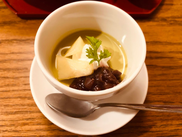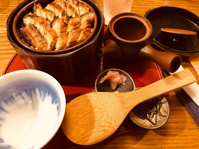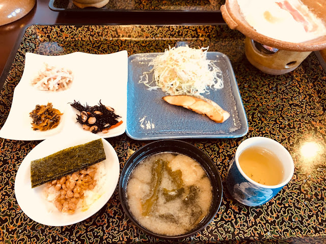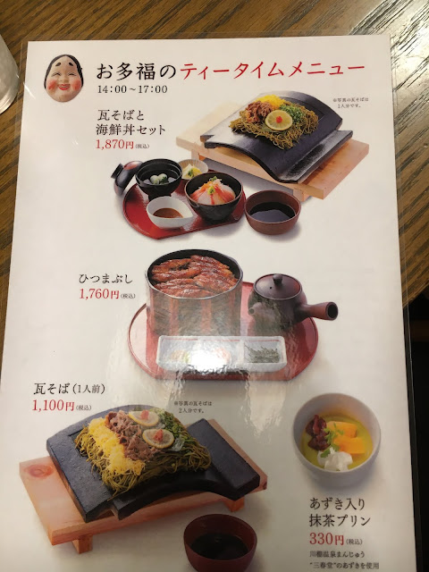 14:05,我们到吃饭的地方了(川棚グランドホテル的餐厅),刚好过了5分钟错过午饭套餐了。这里主打瓦そば,另外还有鳗鱼饭。不过我们昨晚吃了瓦そば,大家就点了鳗鱼饭,还有抹茶布丁。这里的鳗鱼饭不是一般那种蒲烧,是带汤的,这个寒冷的天气吃的很舒服。这顿饭我们用了昨天酒店给的1000元go to travel。每人1400多,包括鳗鱼饭,抹茶布丁及温泉入场券。