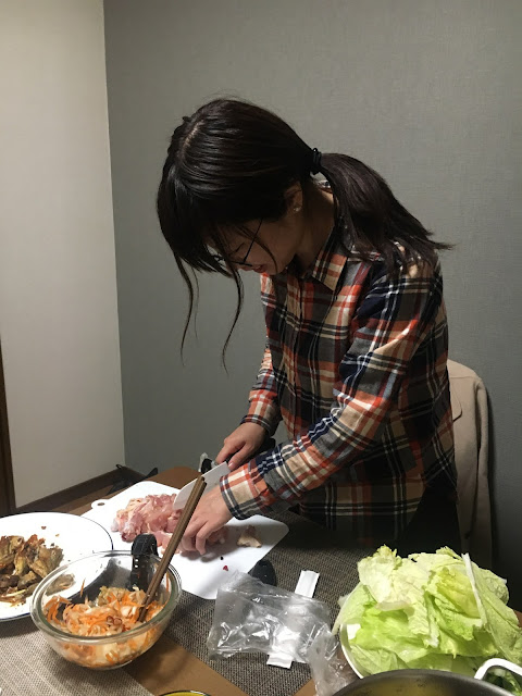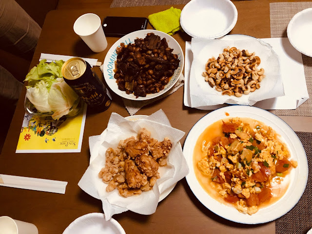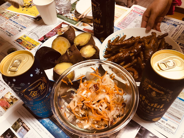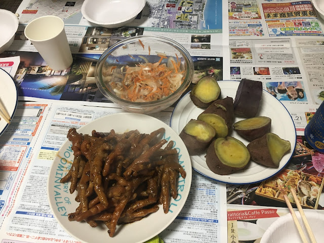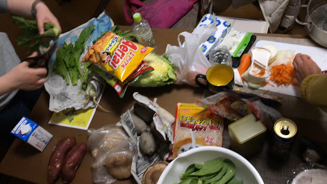由于要大概六点到北九州,我们就直接去了。周五下午还没进入下关市就堵车了,大概堵了有1小时吧,最后6点半到酒店。晚饭去学长家里吃,本来打算在楼下中餐馆买点外卖过去,不过后来时间不够,没想到学长做的菜都够我们全部人吃了,还有饮料。能吃学长做的饭真是福气啊!他可是前一天就准备的呢。