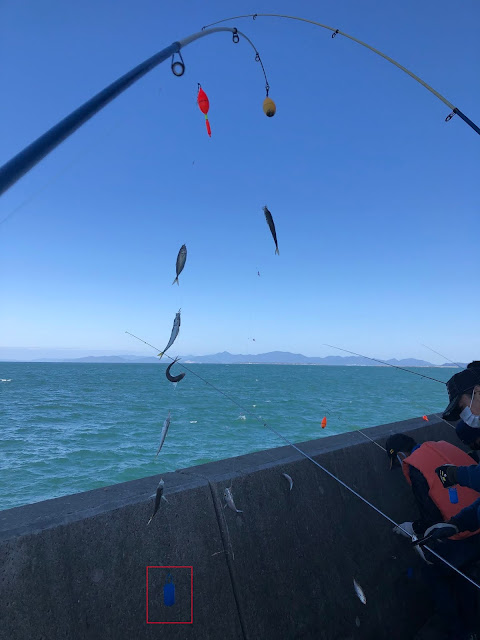 サビキ只能钓小鱼的。和钓大鱼的鱼竿不一样,一般鱼竿是最尽头放鱼饵,但サビキ身上很多小勾的,每个小勾可以钓一条小鱼。上次在龙王岛我们就在每个小勾上挂鱼饵,但这次租的鱼竿是最尽头部分有个框,框里面放鱼饵。鱼竿一放进海里,鱼饵会飘出来,之后鱼就会上钩(其实我不明白,鱼钩没有鱼饵为什么它们会上钩的...) 。