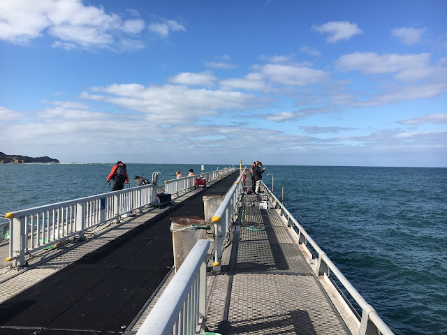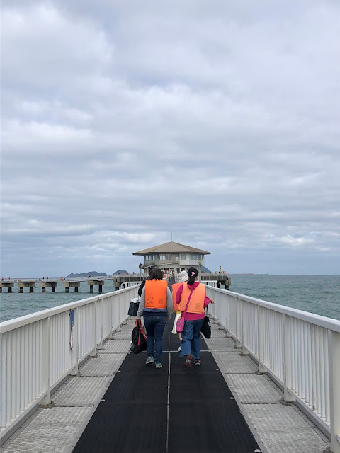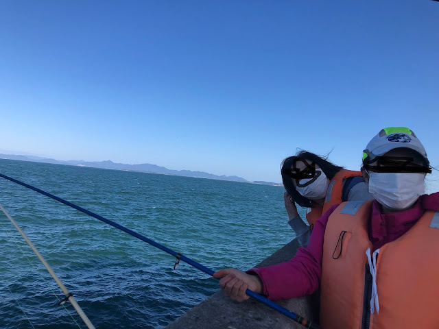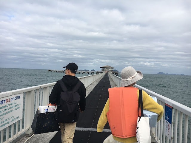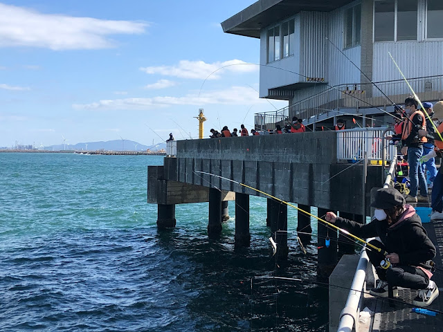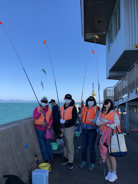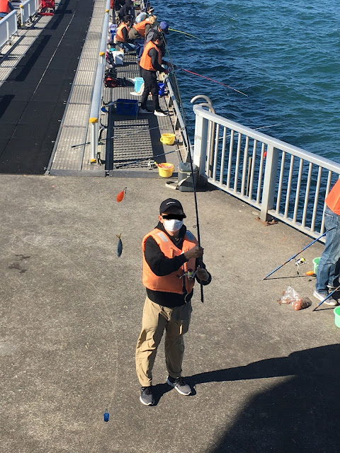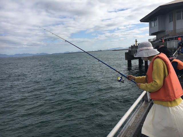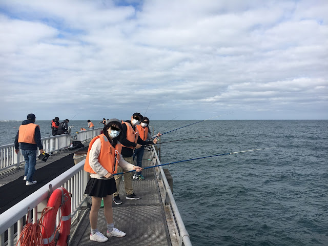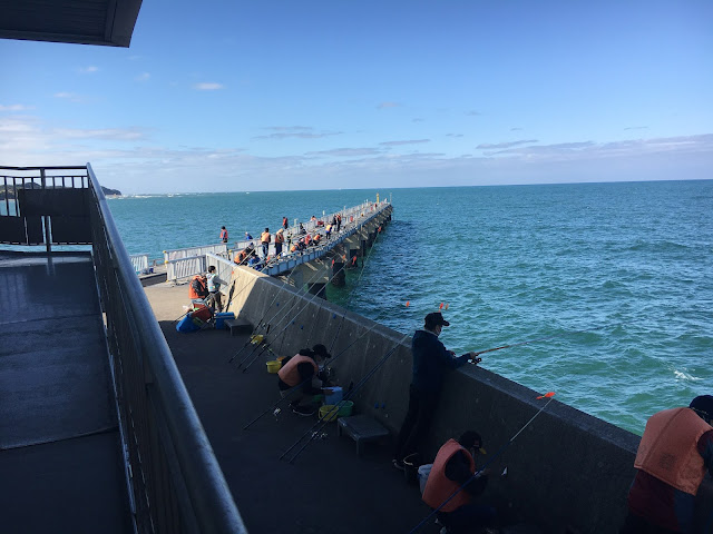 到了停车场,再走段路就到钓鱼栈桥了。栈桥我觉得往海岸伸了两三百米吧,所以是海钓。这里设计得很好,附近有海滩,很漂亮。今天晴天就更漂亮了。进去收费点后就不能再出来的,里面厕所,吃的休息的地方什么都有。而且百分百保证钓到鱼,1000元像我们这种不会钓鱼的,图个乐很划算。钓到的都是竹荚鱼,我看有人带不是サビキ的鱼竿,能钓到其他种类的。