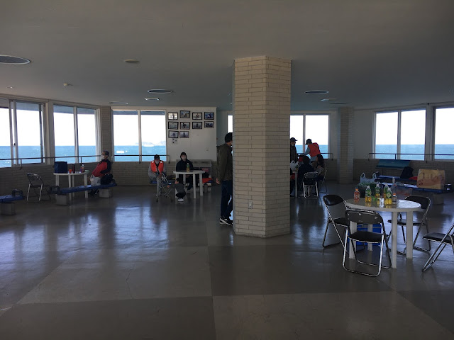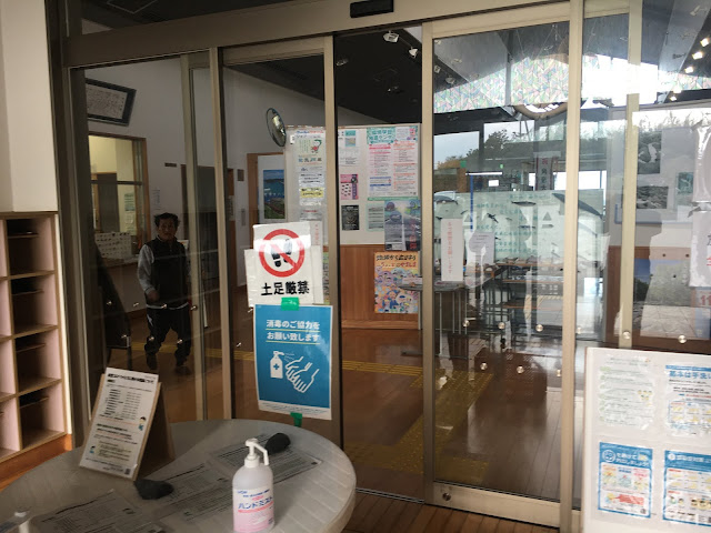 大概不到十分钟,我们就到了つのしま自然館(角岛自然馆)。一进门就发现里面的格局和天狗高原那个一摸一样,都是有拖鞋,免费,有阳台看风景。