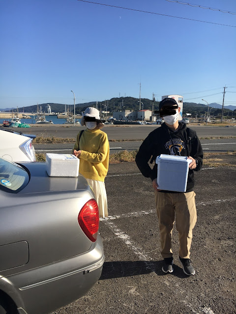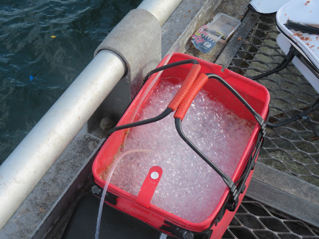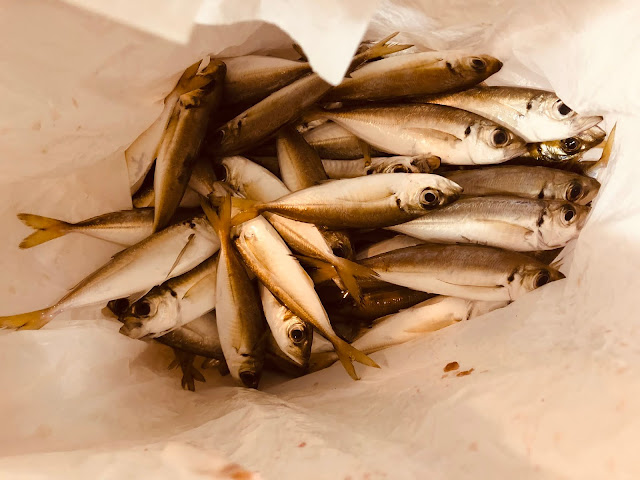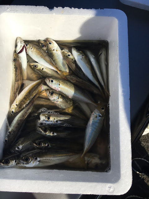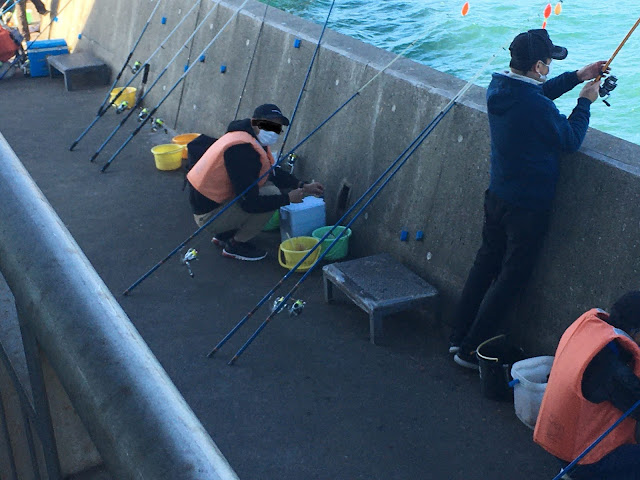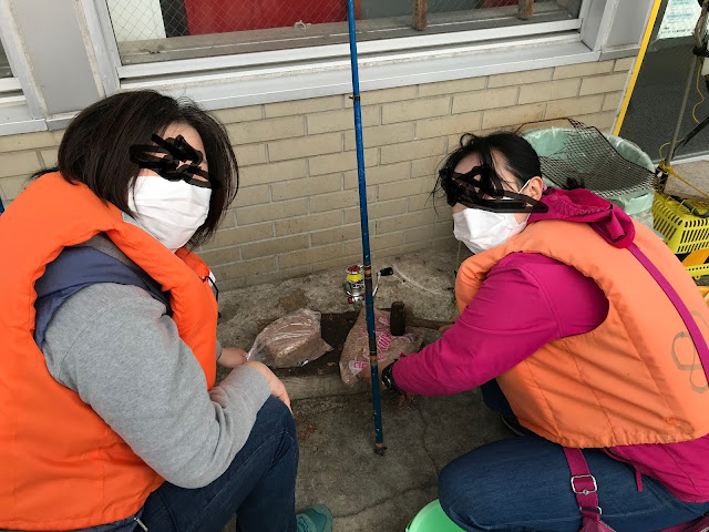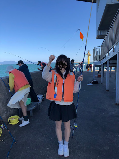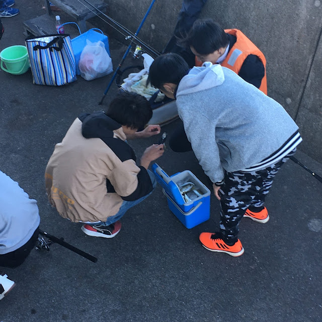我们一开始位置不对,浪费了些鱼饵,但最后我们还是钓了100多条(5个人租了4分鱼竿套餐)。话说我带过来的两个泡沫箱子,一个是7月四国之旅我们买的伊势海老外卖,我一直留着,另一个就是3月底洗碗公主毕业时给我的,这两个箱子我一直留着就是想什么时候钓鱼用。