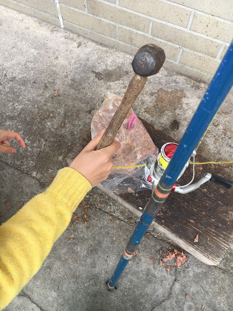 我们拿到鱼竿及鱼饵后,要先处理一下,因为鱼饵是有些冰的,要先敲碎。サビキ也要自己整理。