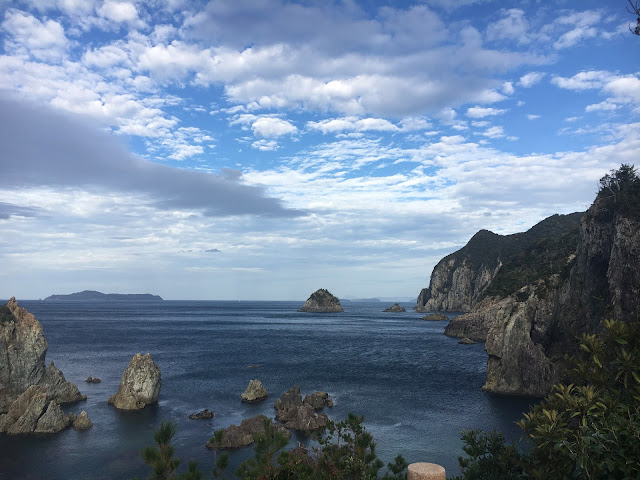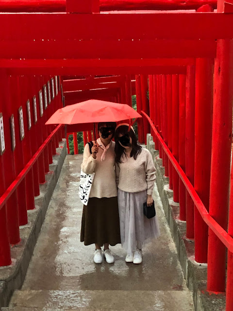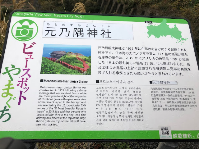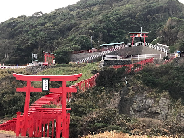 三点半我们出发去元乃隅神社了 。今天预报是会下雨,在青海岛还有点太阳,不过去到元乃隅神社就下雨了。但下雨也有另外一番景色呢。
