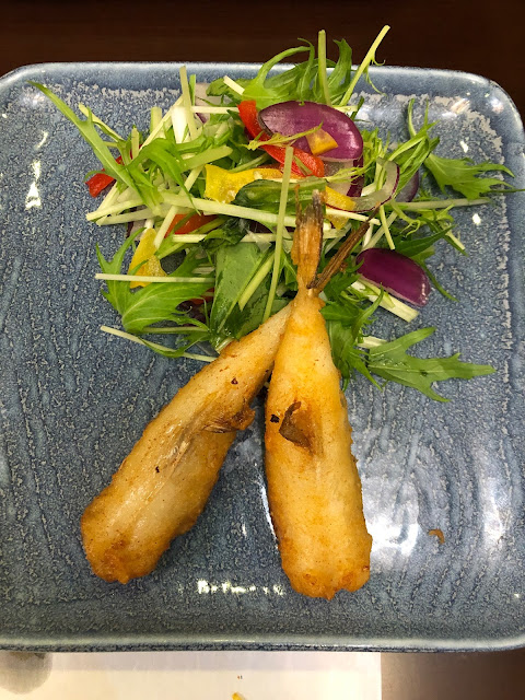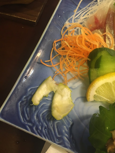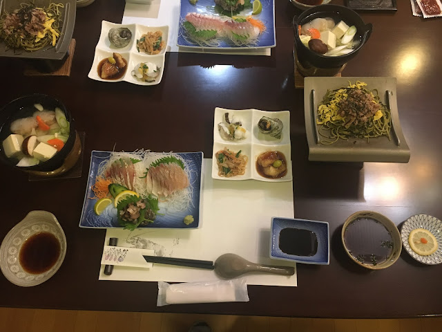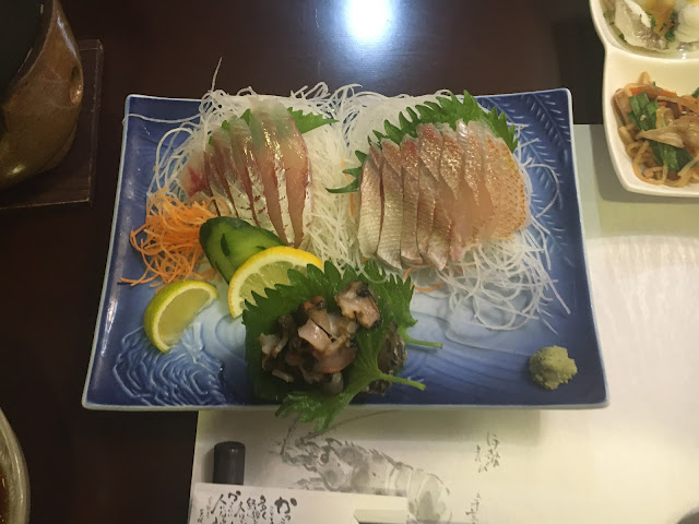 这顿晚饭非常丰富,生鱼片尤其多。我特别喜欢下图带皮的,肉质爽脆,叫イトヨリダイ,属于高级鱼,产于日本西部,在濑户内海没见过的。