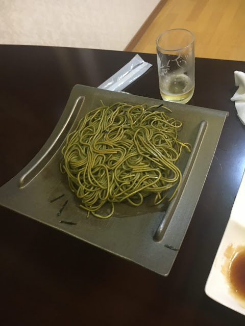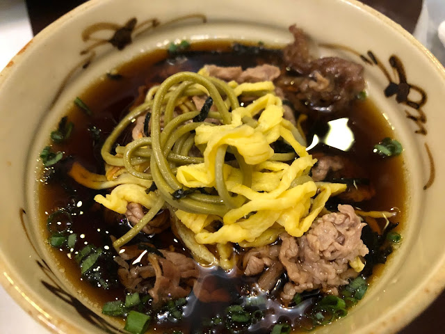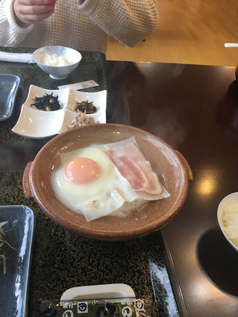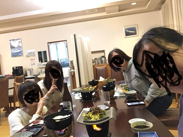 这个面条是川棚温泉(我们第二天就去这个温泉)特产瓦そば,我以前也吃过,不过这里是现场加热,自己可以参与制作,一边的面烧的差不多的时候就把表面的菜先拿下来,把面条翻一下让另一面也烤脆,最后配汤汁吃。