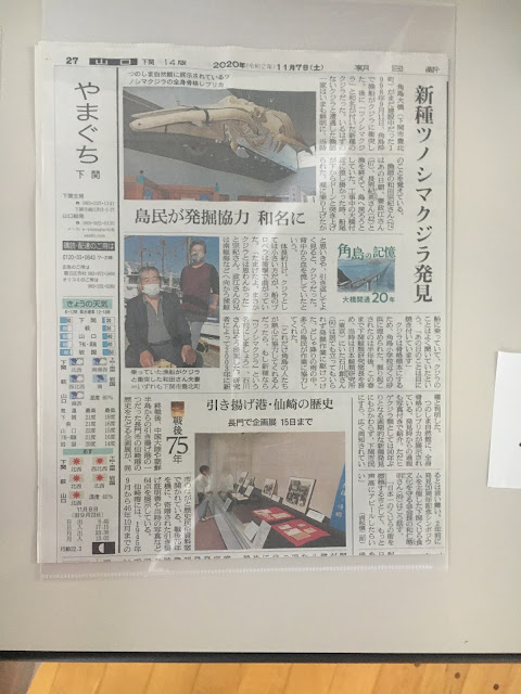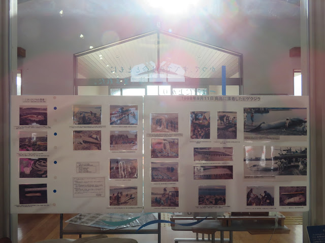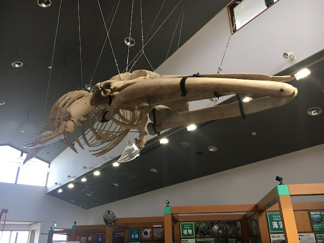 一进去就有导游给我们介绍,听了鲸鱼的故事,特别有意思。不是导游的话,这个自然馆一会儿就看完。话说,2003年,角岛附近有一个鲸鱼妈妈和渔船相撞,被误杀了。之后尸体就被拉去角岛,先进行研究,然后把尸体埋在沙里,过了一段时间再把骨头挖出来。经过研究,发现这是个新品种,因为是首次发现,研究结果刊登在nature,而这个品种日语名也以角岛命名,叫