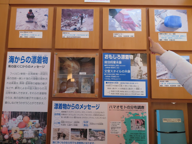 看完鲸鱼,馆内有其他介绍,例如我们昨天在青海岛海滩看见的垃圾,在角岛也有很多南面海域(地理原因,海水是南往北的)飘过来的垃圾,例如当年中国洪水,就连长江的文物都飘过来了。