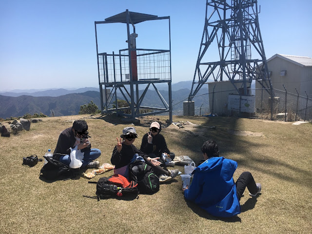 我们就坐在草地上吃午饭,爬了两小时大家都很饿。