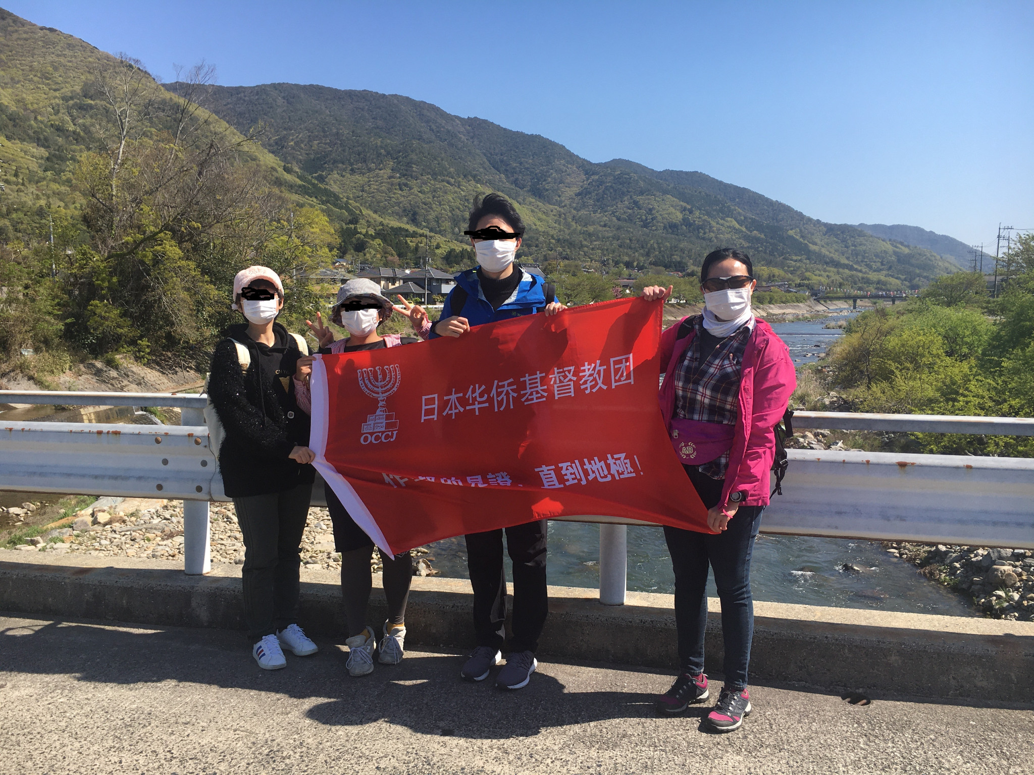 拿旗拍照留念