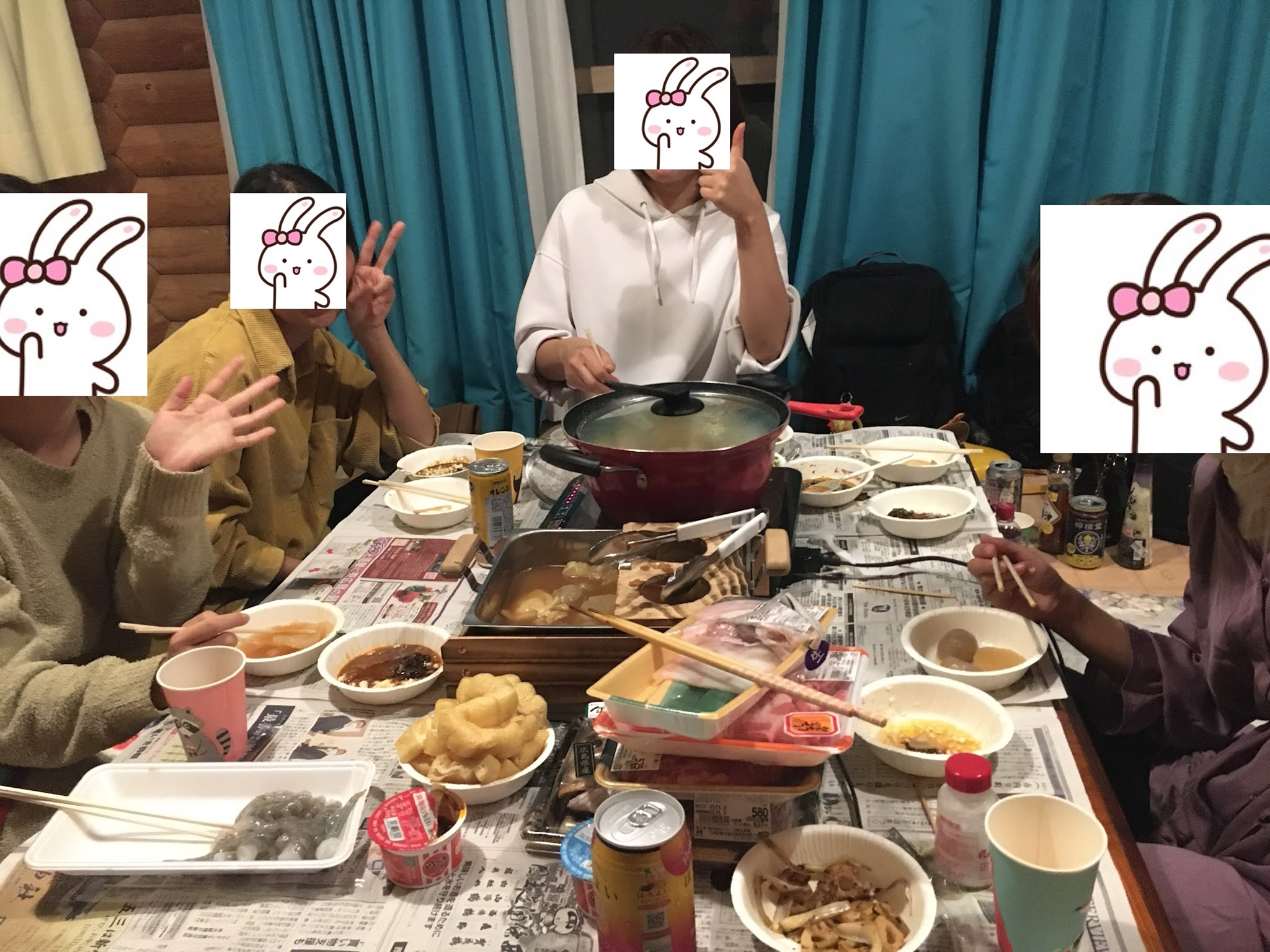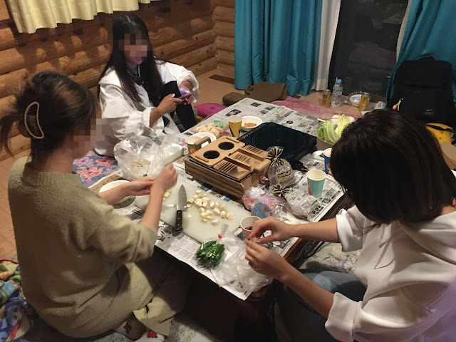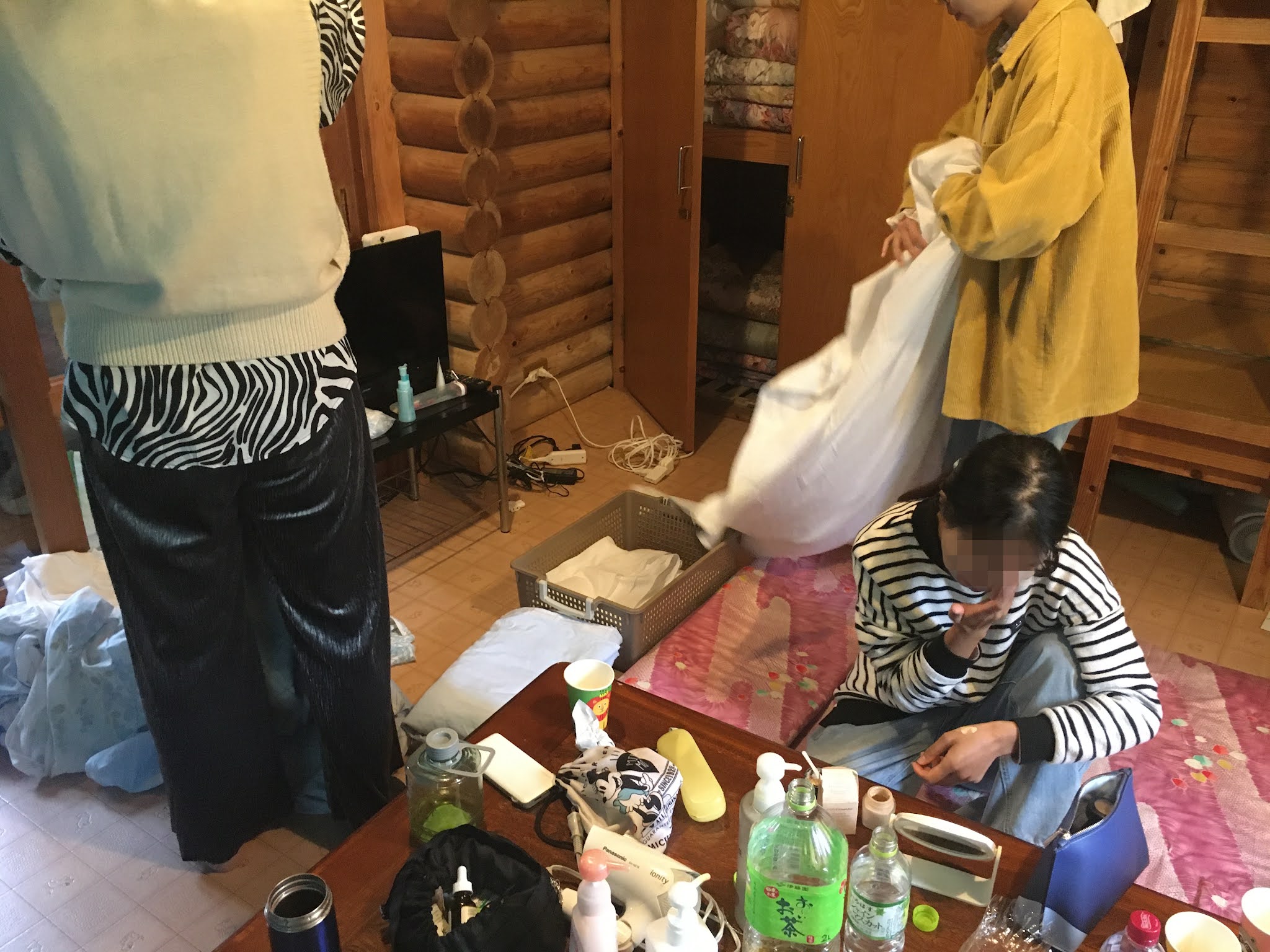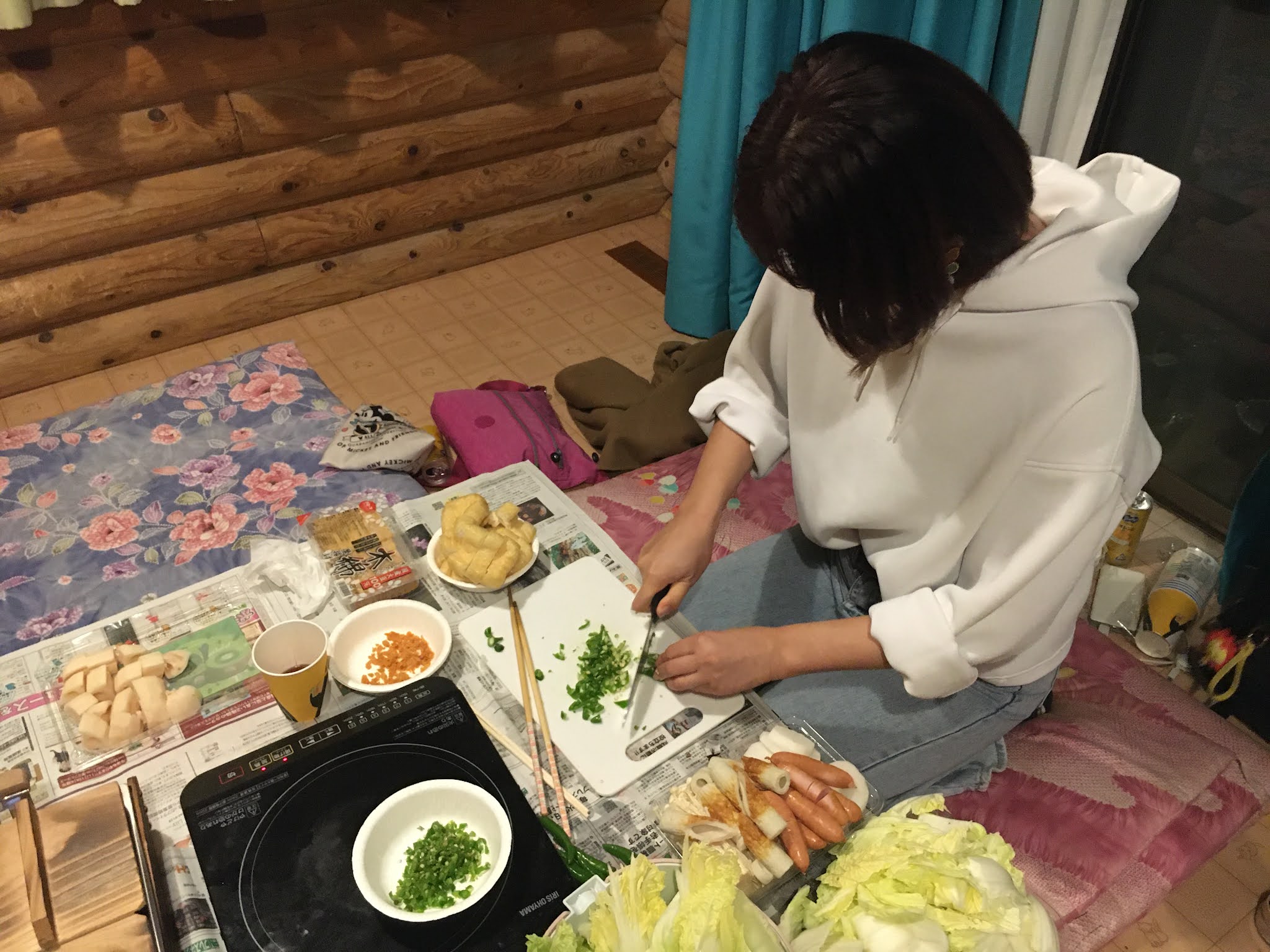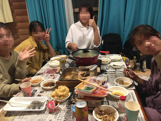 几个人吃饭喝酒聊天很愉快,最后11点才睡。临睡前大家合力铺床铺呢~