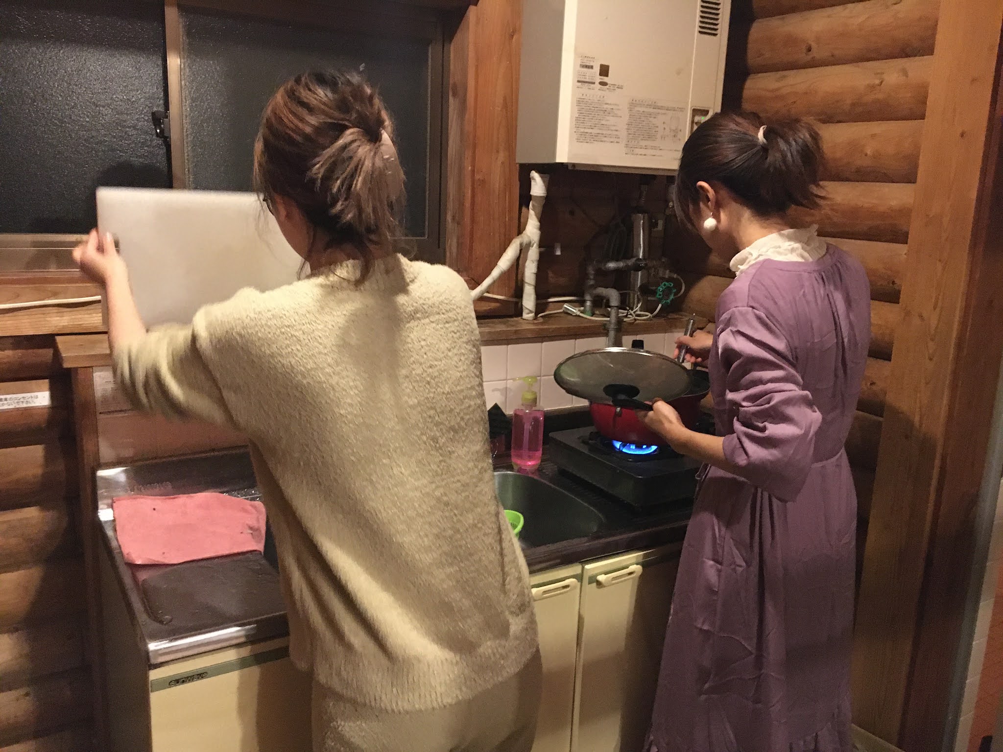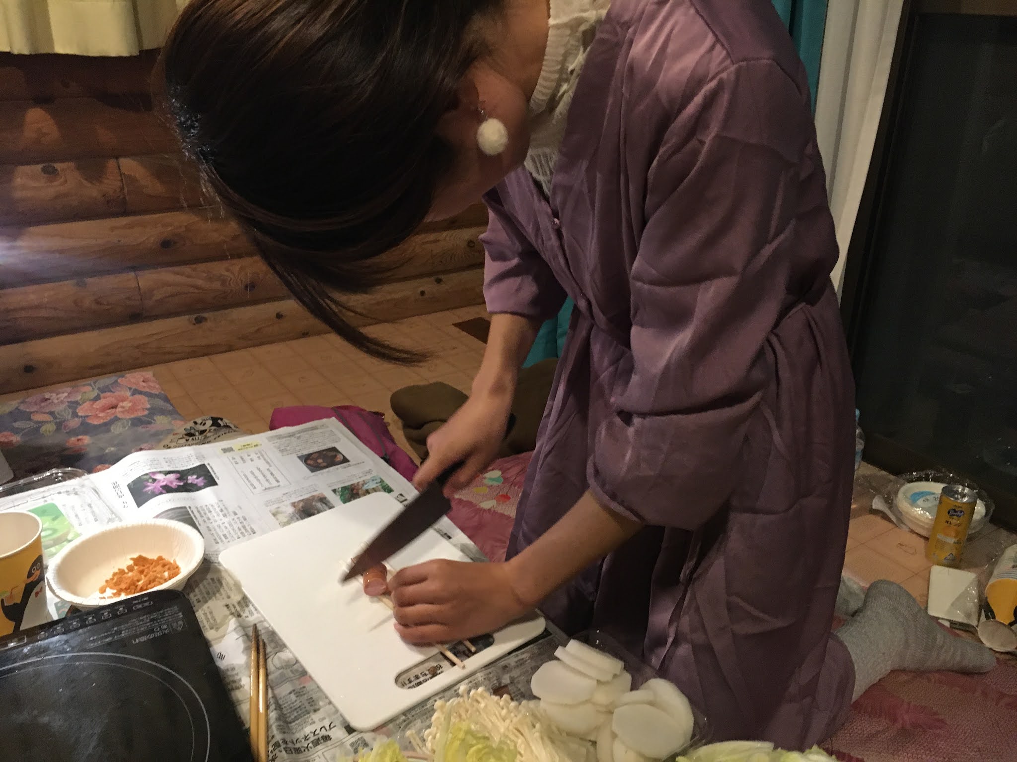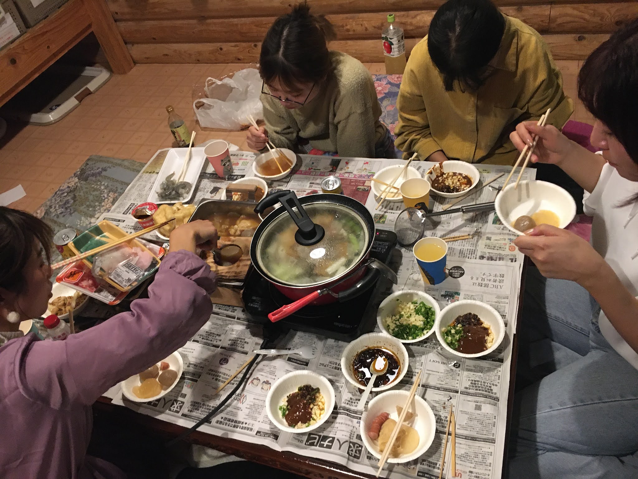 几个人吃饭喝酒聊天很愉快,最后11点才睡。临睡前大家合力铺床铺呢~