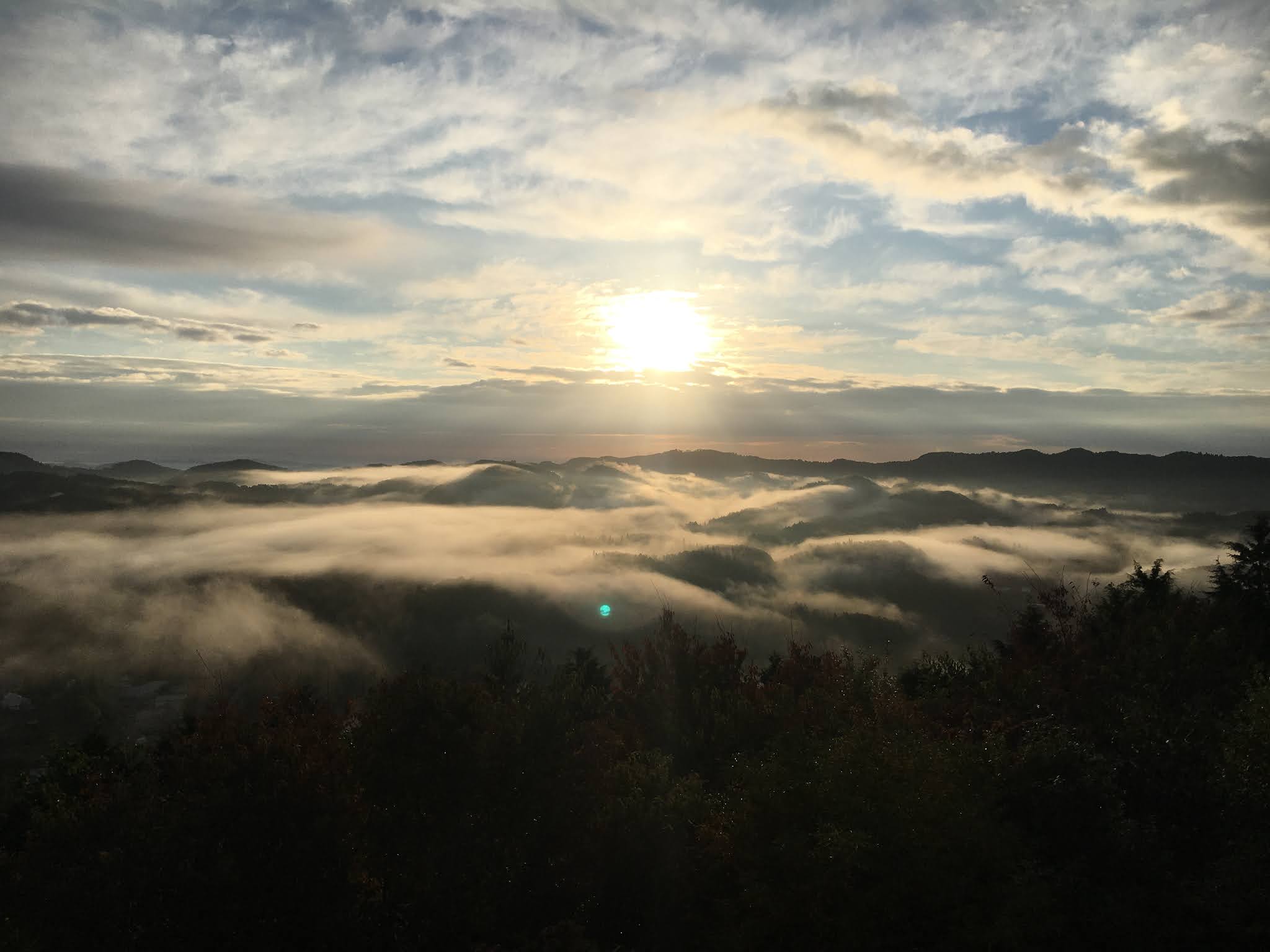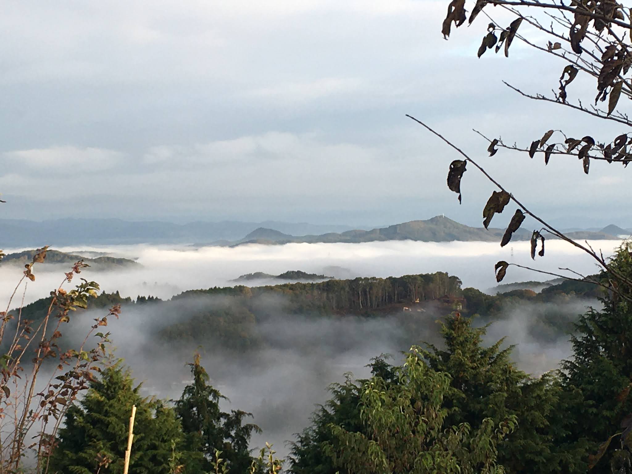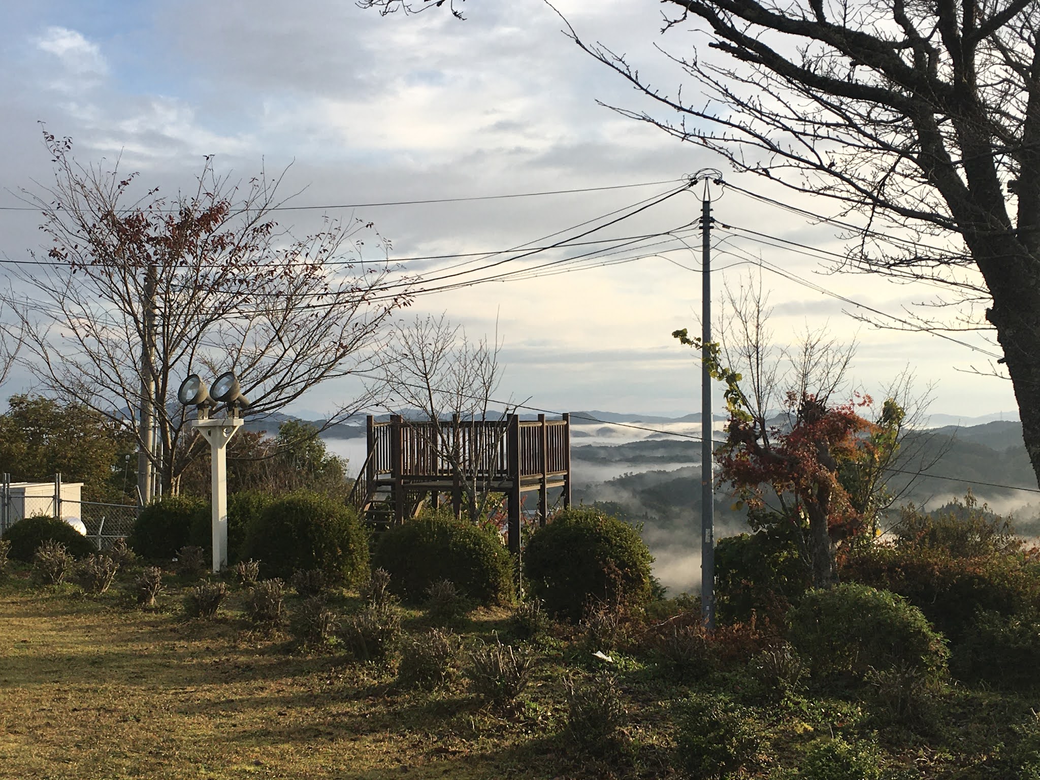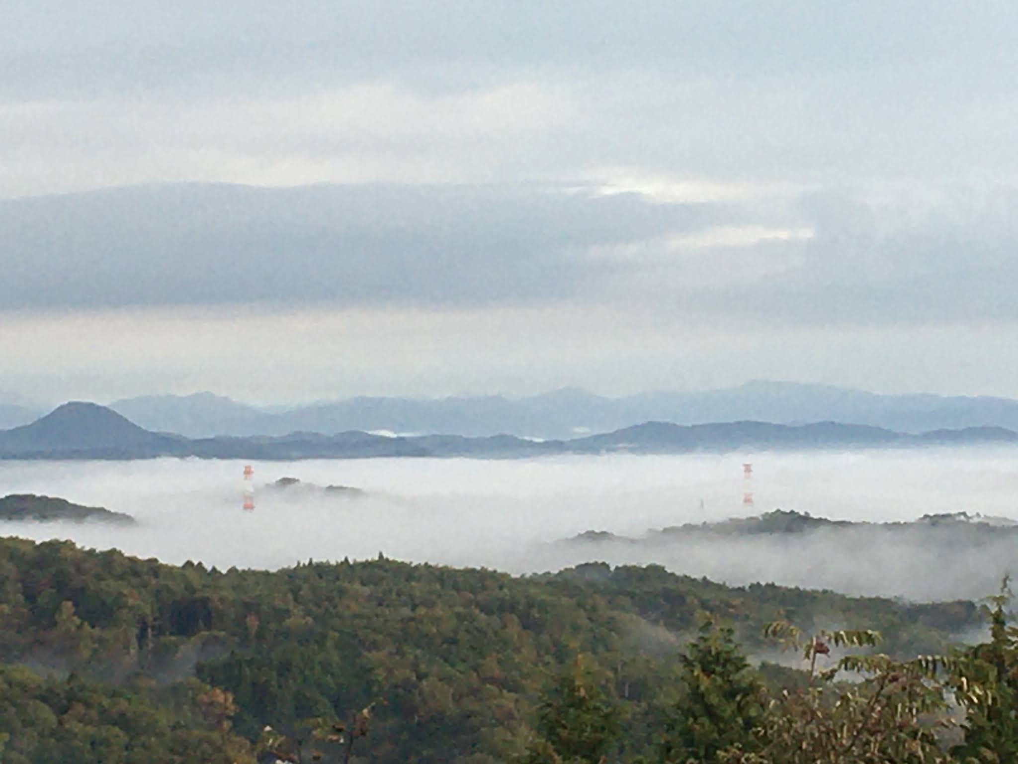 早上不到六点半起来,出发去恋人之圣地看云海,那是米见山,海拔不到700米,我们大概7点到。开车十多二十分钟。最后一段路比较窄,不过当时也没对头车。今天是平时,山上除了我们还有一辆车。