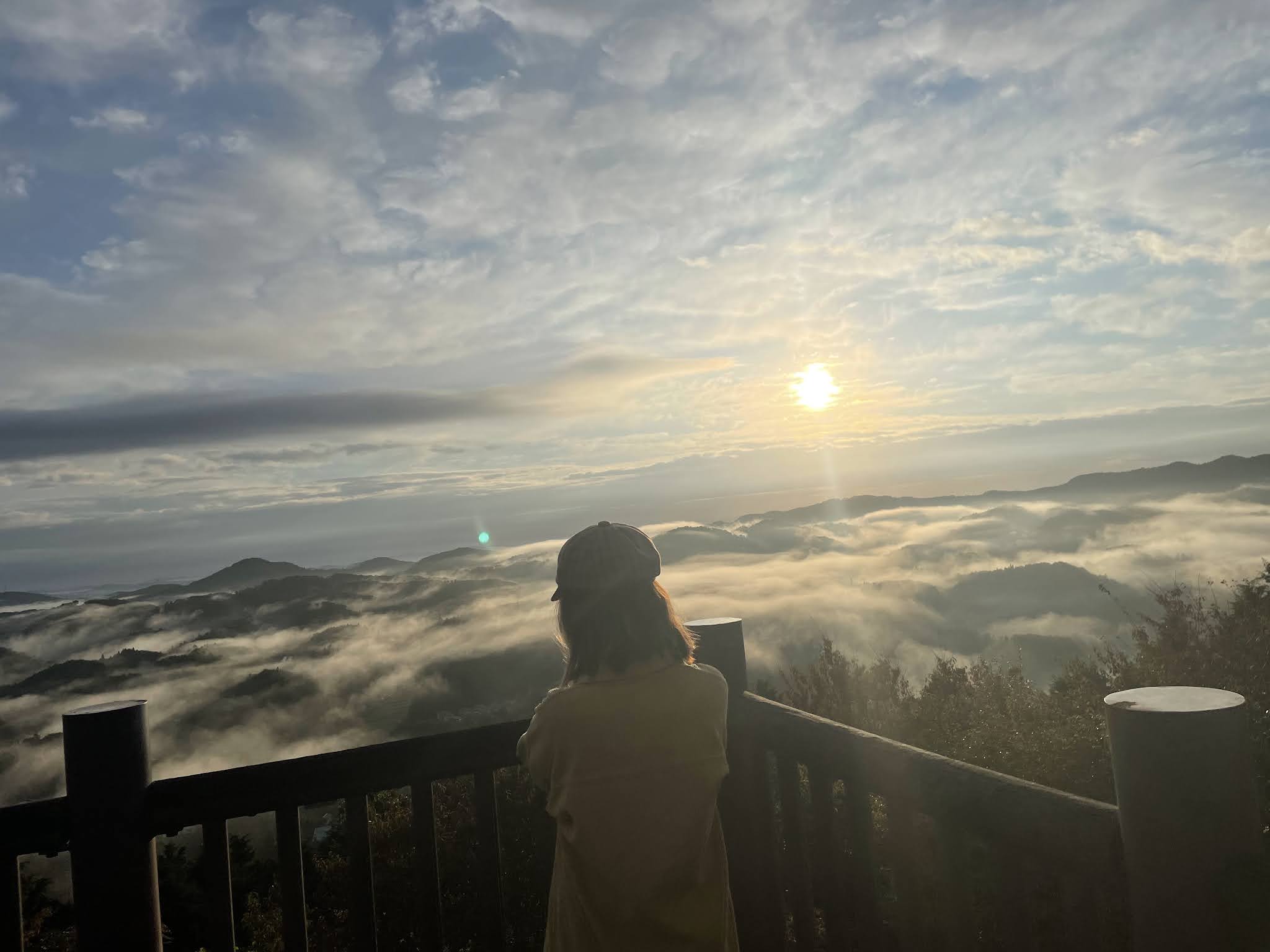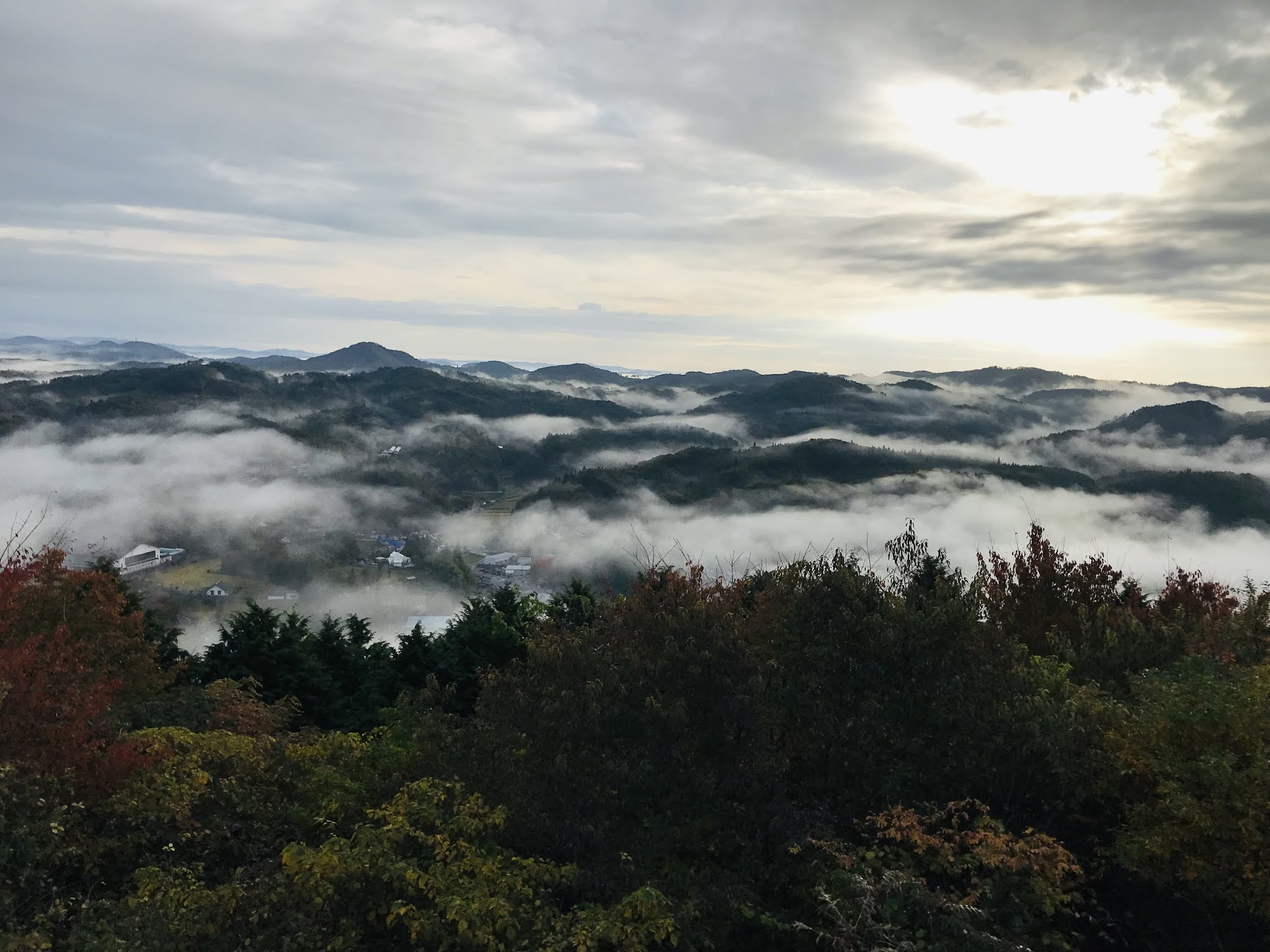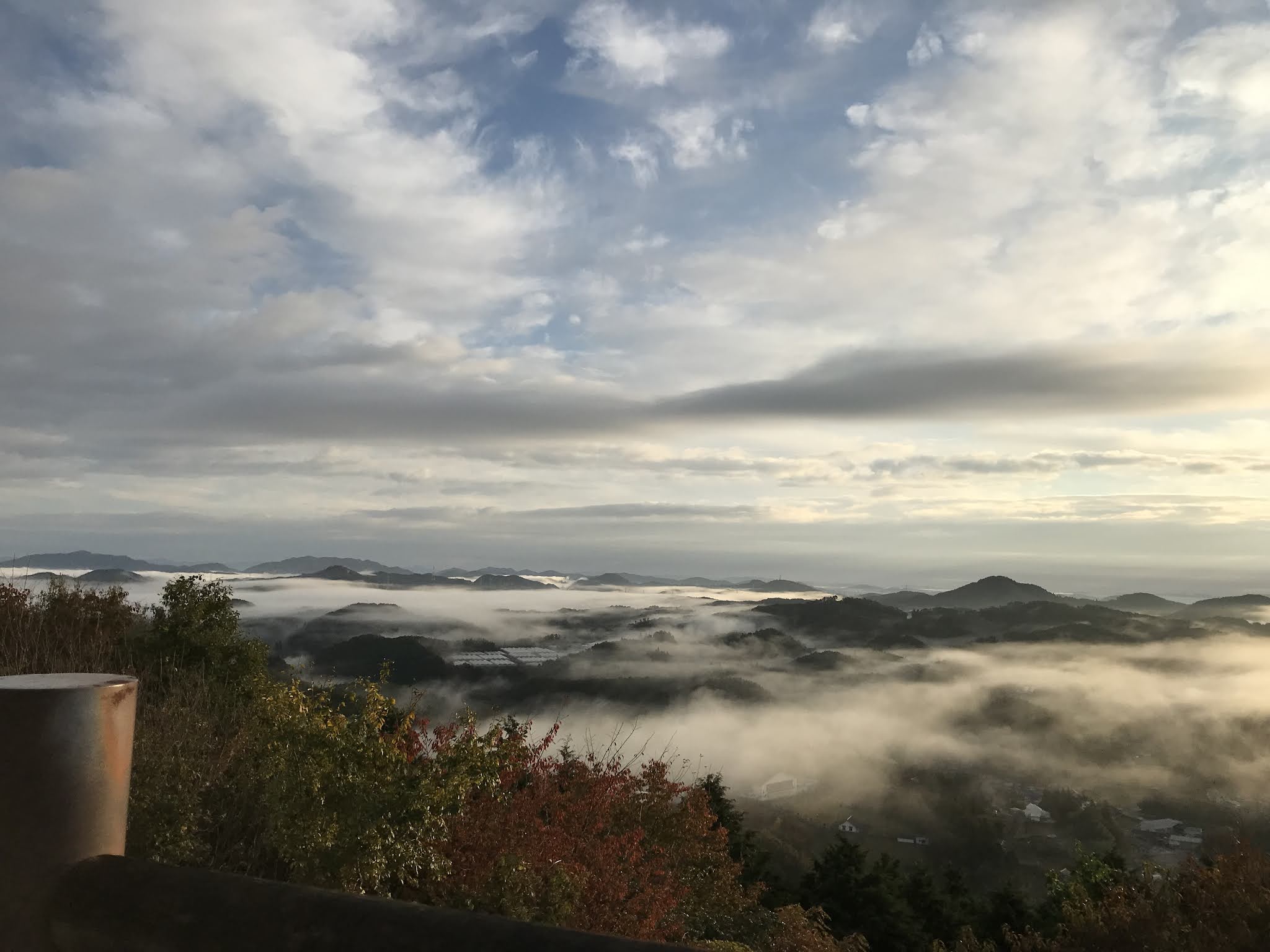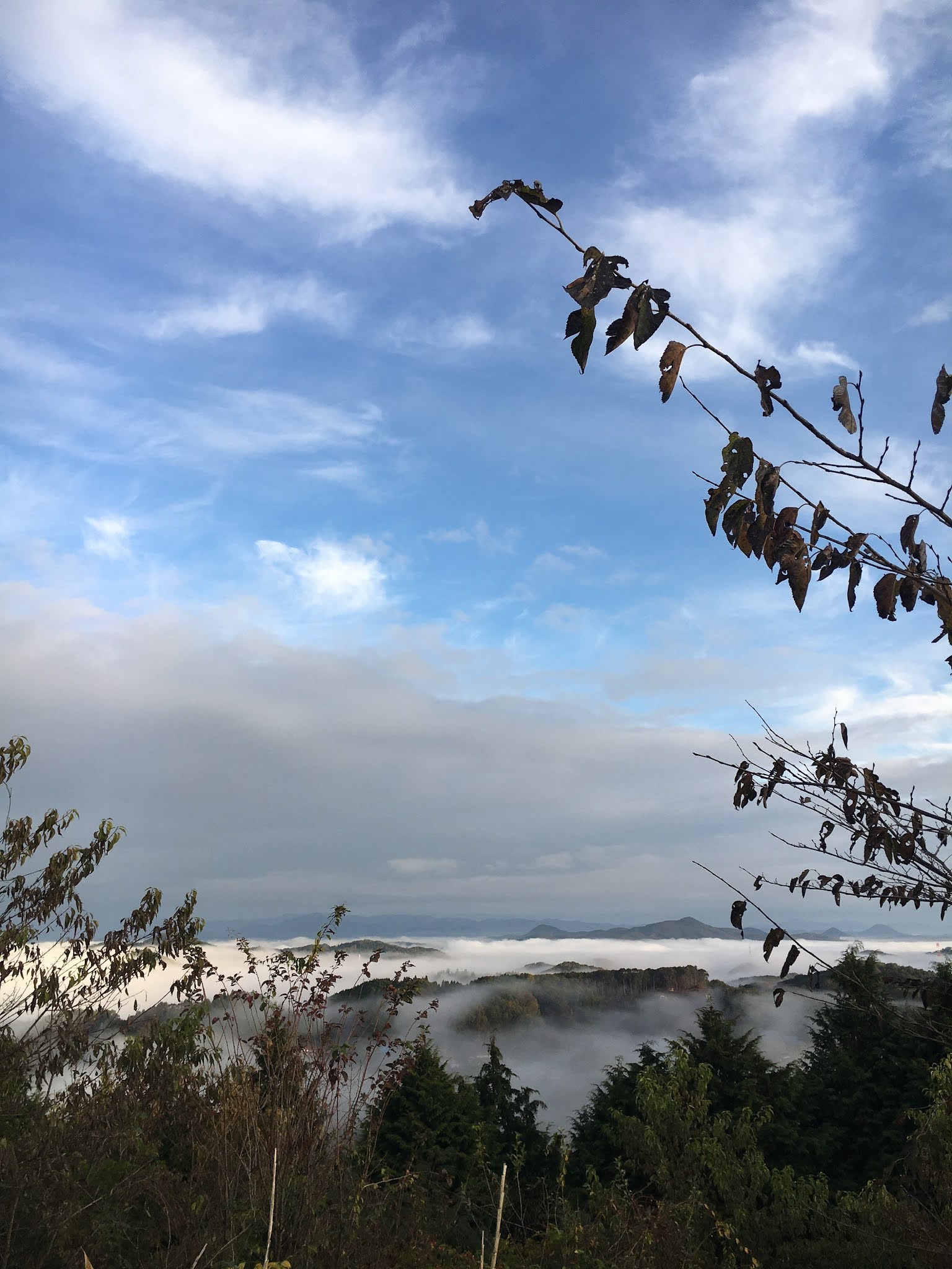 早上不到六点半起来,出发去恋人之圣地看云海,那是米见山,海拔不到700米,我们大概7点到。开车十多二十分钟。最后一段路比较窄,不过当时也没对头车。今天是平时,山上除了我们还有一辆车。